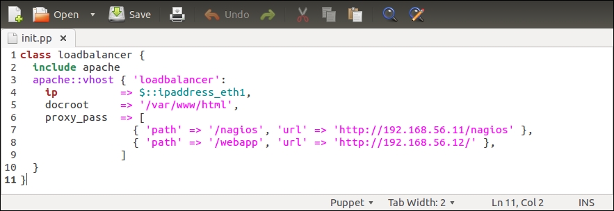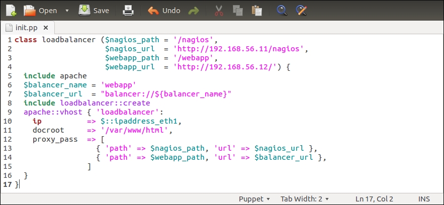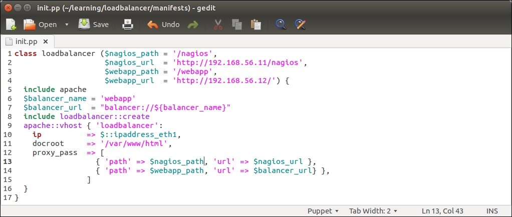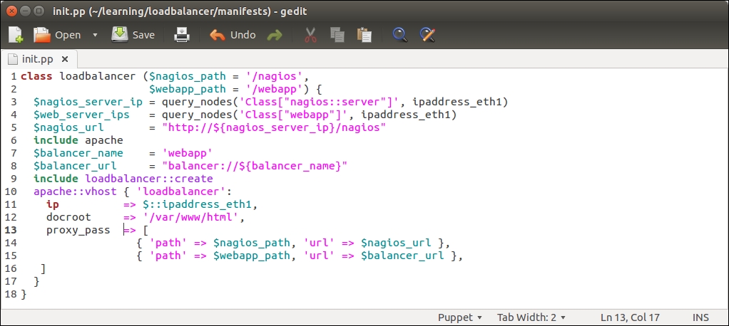 Let's first tackle the loadbalancer class, and add a couple of PuppetDB queries to it. Here is a screenshot of the loadbalancer class in its current state: