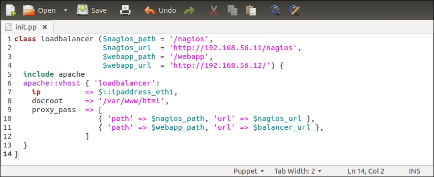 One problem with these classes is that they are currently using the static IP configuration for the nagios server and web server connectivity. The loadbalancer class assumes that the nagios server has an IP address 192.168.56.11, and in the loadbalancer::create class, we assume that the web server nodes have the IP addresses 192.168.56.12 and 192.168.56.13.