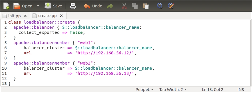 The loadbalancer::create class creates two apache::balancermember records, which we are going to substitute with a defined type that creates the apache::balancermember record for each web server IP address that the PuppetDB query returns (line 4 in the loadbalancer/manifests/init.pp file). Here is the screenshot of the newly designed loadbalancer::create class:
