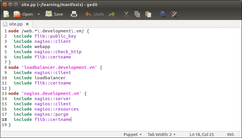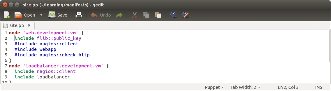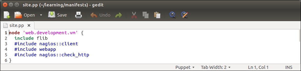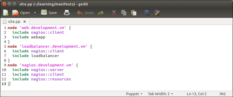 Then we need to associate the class with the web server node. You can choose whether you want to do it by adding an include nagios::check_http statement to the webapp class in the learning/webapp/manifests/init.pp file or by associating the nagios::check_http class via the node definition file learning/manifests/site.pp.