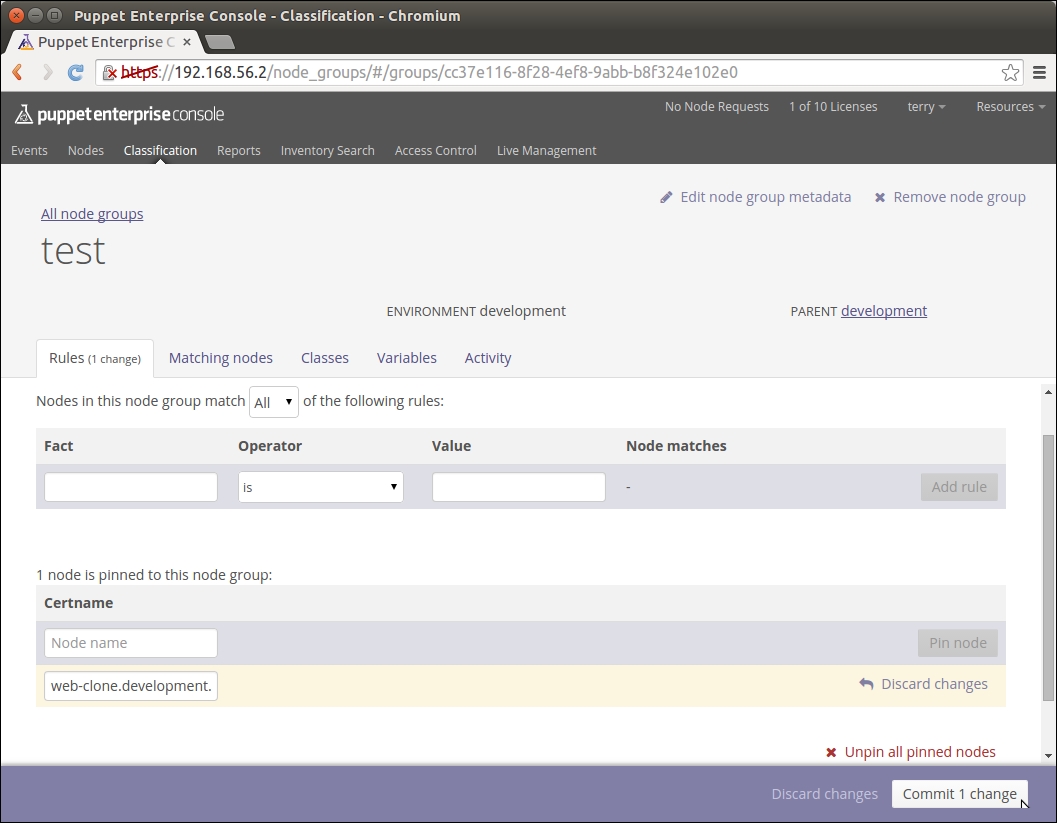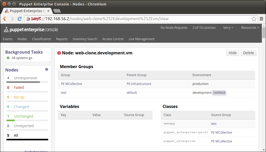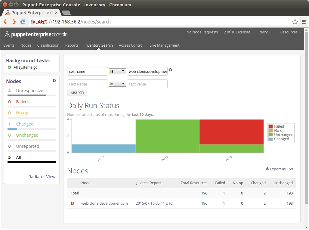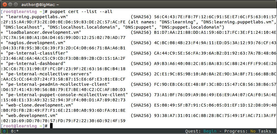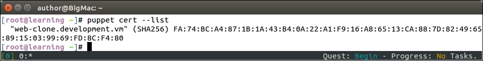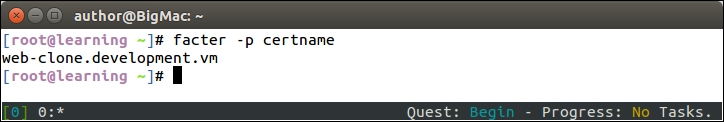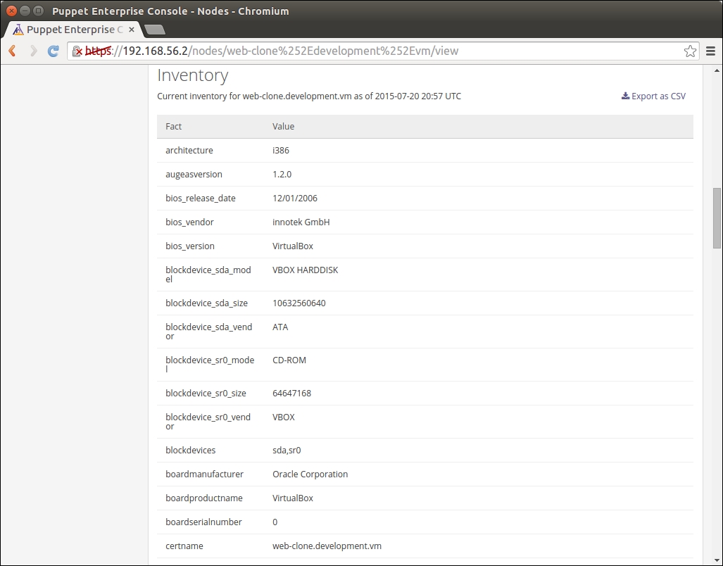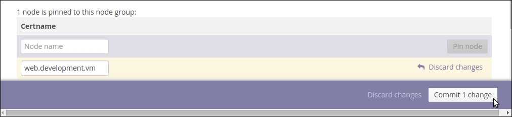 In addition to the string nagios.development.vm, the query returns a string web.development.vm, which is the certname of the web server node, as shown in the following screenshot: