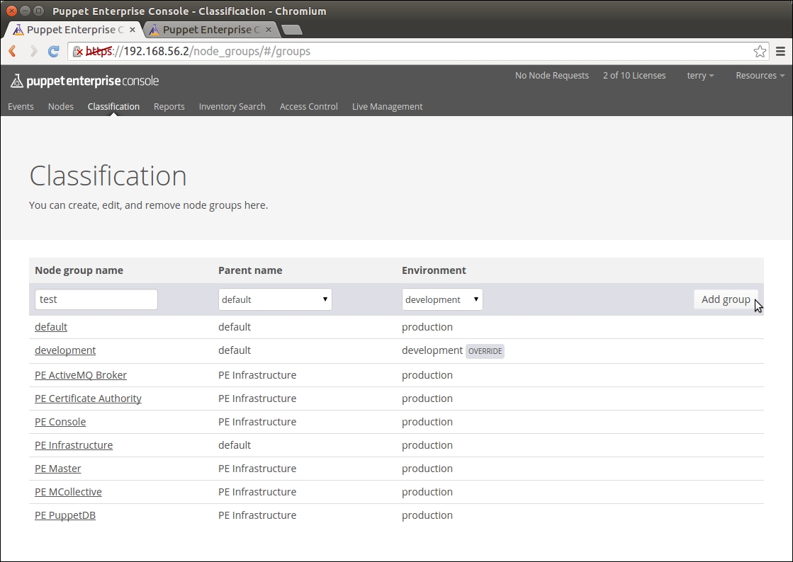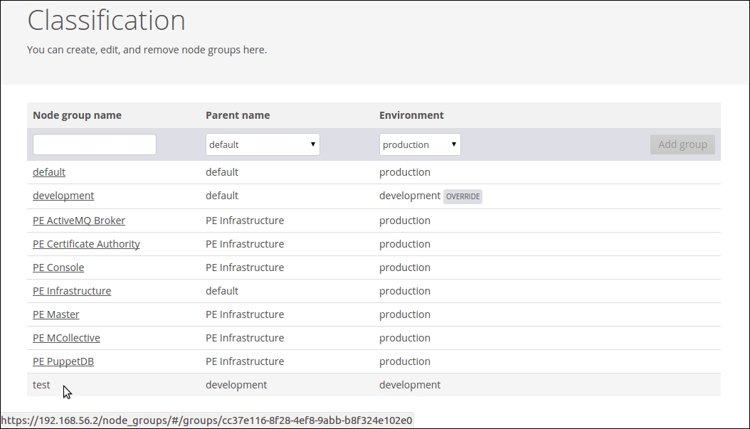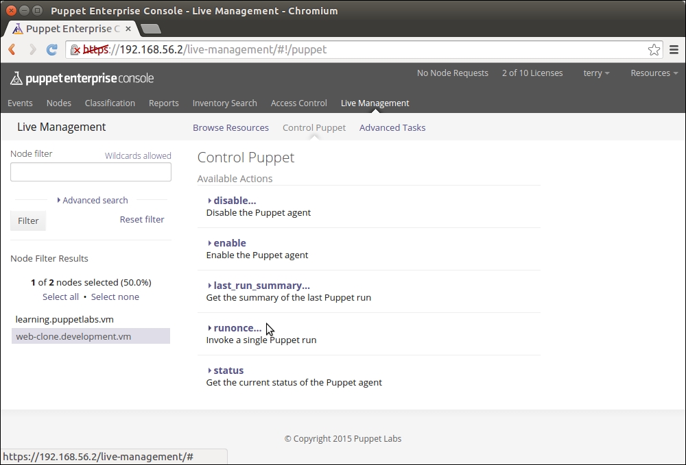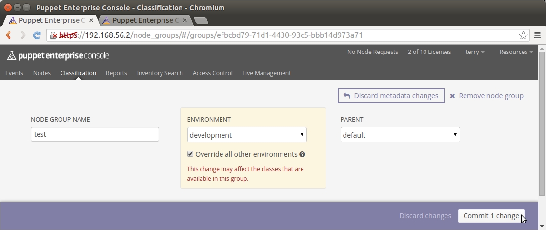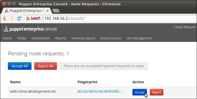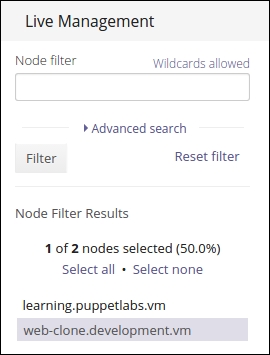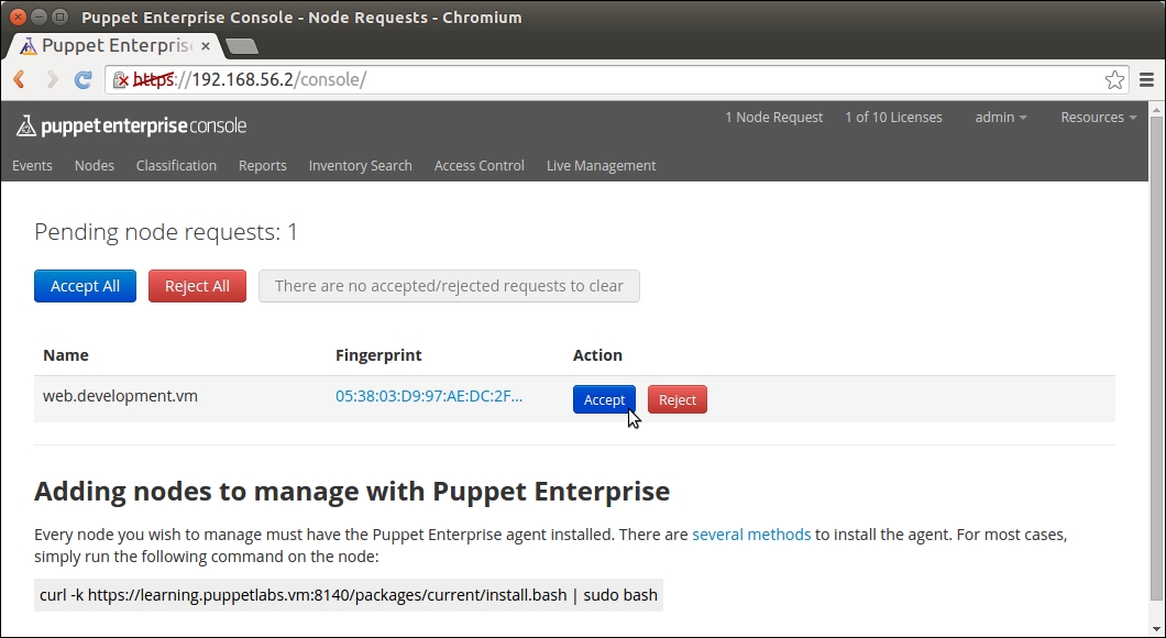 In addition to the string nagios.development.vm, the query returns a string web.development.vm, which is the certname of the web server node, as shown in the following screenshot: