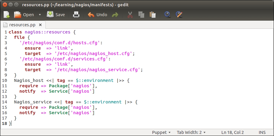 On lines 2 to 4, we declare a resource called resources that is applied to the nagios_host and nagios_service resource types. The resource contains a purge => true attribute that tells Puppet to delete all the nagios_host and nagios_service resources that have been removed from the manifests.