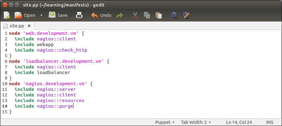 Open the node classification file, manifests/site.pp, and add an include nagios::purge statement to the nagios.development.vm node definition block, as shown on line 14 in the following screenshot:
