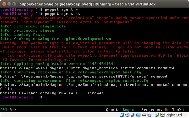 Once you've saved the file, go to the nagios server console and run the puppet agent -t command. The following output confirms that the nagios_host and nagios_service resources were removed successfully, and the nagios server process got reloaded: