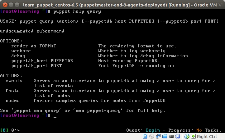 To make the change effective, you must log out and log in to the Puppet Master node. Once you are logged in again, you can verify that the puppetdbquery module is available by running the puppet help query command, which displays the help menu, as shown in the following screenshot: