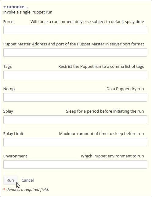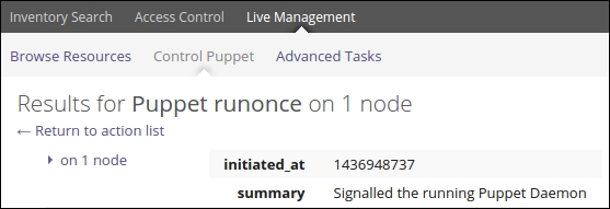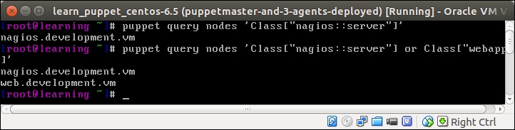 Let's first try the nodes action and make a PuppetDB query that returns the certname of the node that includes the nagios::server class in its catalog. We can do the query using the following command: