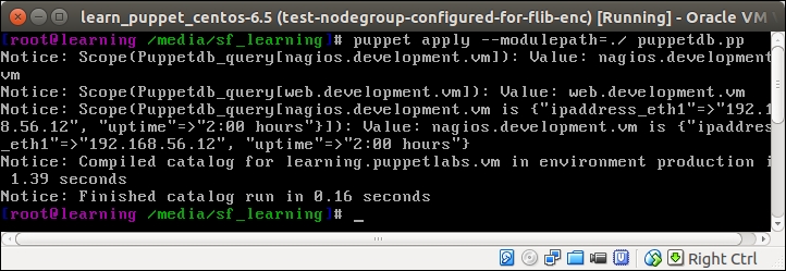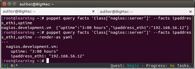 For example, if we wish to find out the IP address that belongs to the nagios server node, we can make a query that asks for the value of the ipaddress_eth1 facter on the node that has the nagios::server class in its catalog.