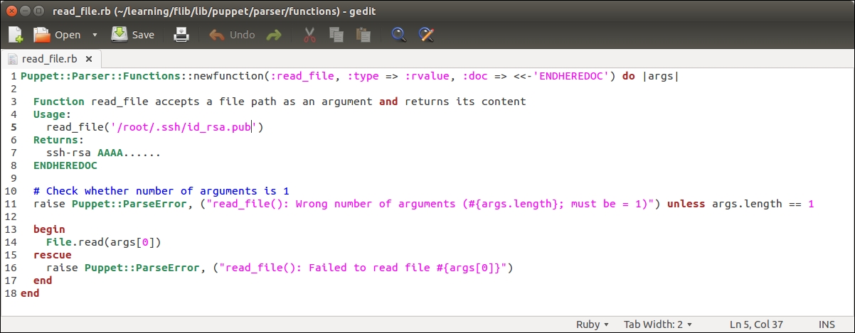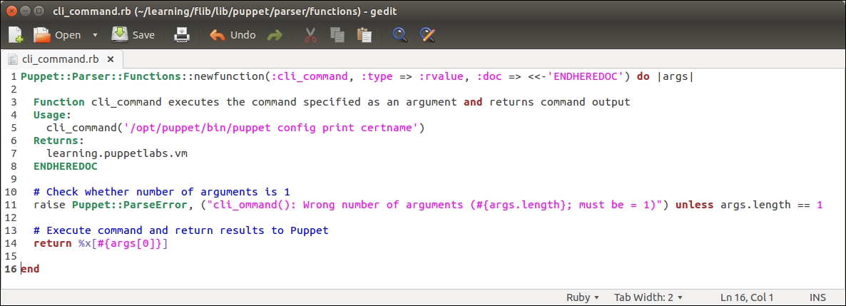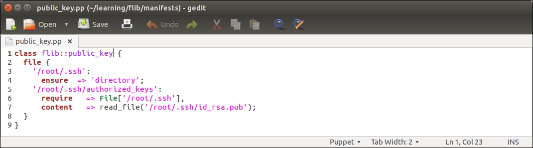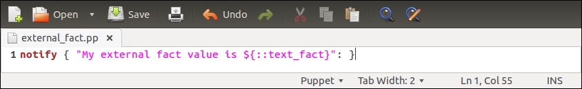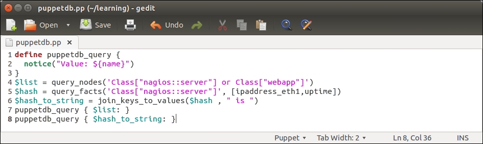 Once you have created the file, save it as puppetdb.pp under the Puppet module directory learning (on the virtual machine /media/sf_learning/puppetdb.pp).