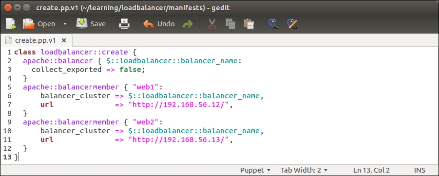 Before we try running this manifest on a load balancer, let's make a couple of changes to the loadbalancer::create class, which currently has the following content: