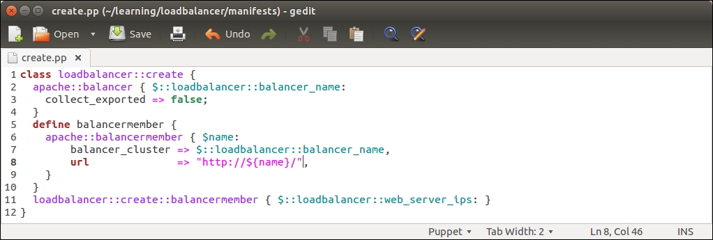 Lines 5 to 12 in the previous version of create.pp have been replaced by the defined type balancermember (lines 5 to 10). The balancermember type contains a reference to another defined type called apache::balancermember, which creates a new load balancing endpoint based on the ${name} variable. The endpoint URL is defined by the url attribute on line 8, which has a value http://${name}/. The ${name} variable is a reference to the name of the defined type, which is specified at the time when a type is called (on line 11). For example, if the type is referenced with a name 192.168.56.11, then the value of the url attribute will be http://192.168.56.11/.