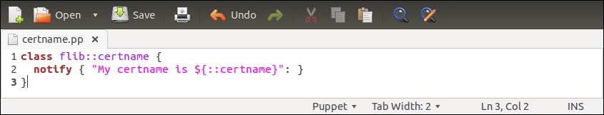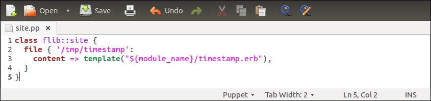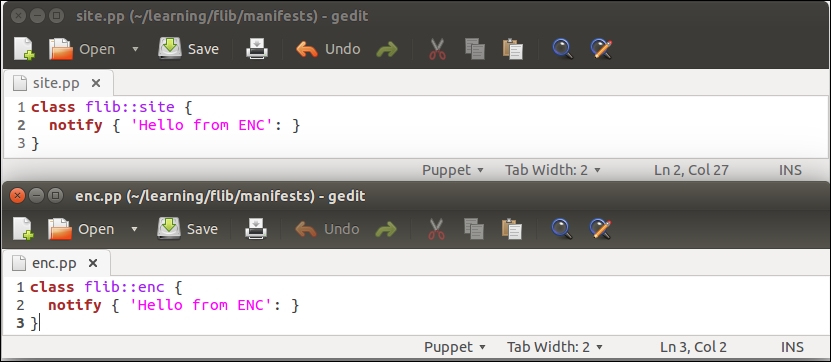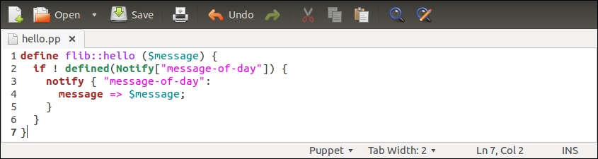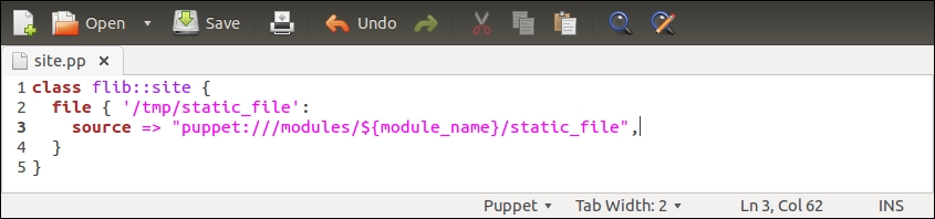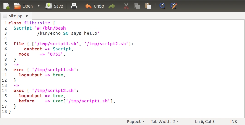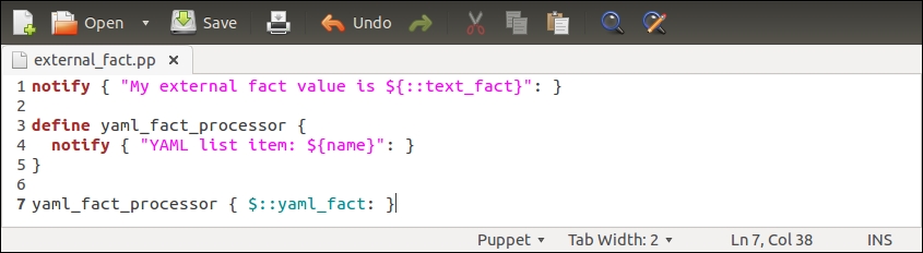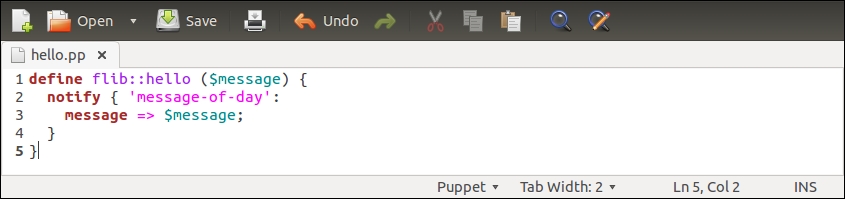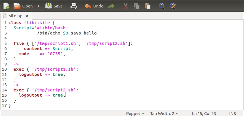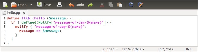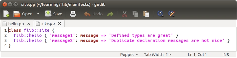The preceding manifest contains a custom defined type (lines 1-3), three variables (lines 4-6), and two references to a defined type (lines 7-8). Let's take a look at the manifest in detail: