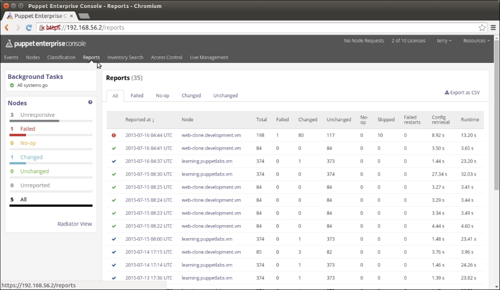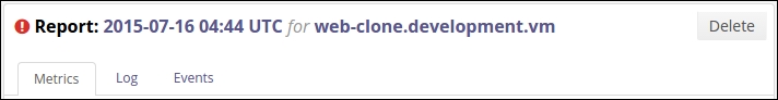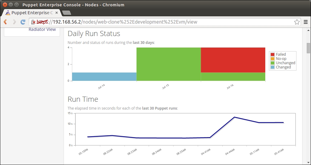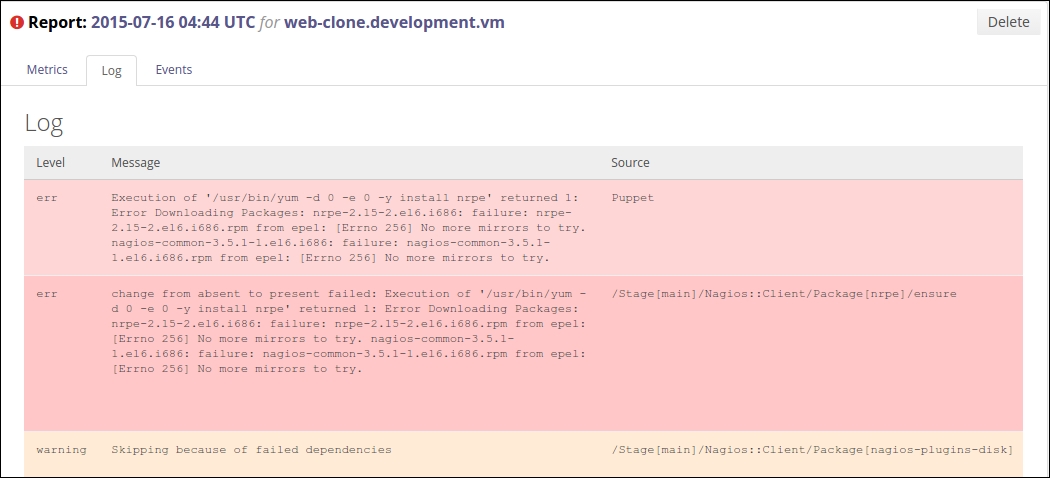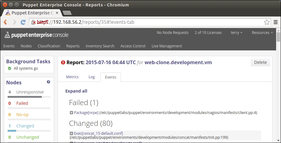 The Puppet run on the web server node doesn't show any nagios-related activity in the Puppet report but, when Puppet is run on the nagios server node, you will see the new Nagios_host and Nagios_service resources being imported on the server.