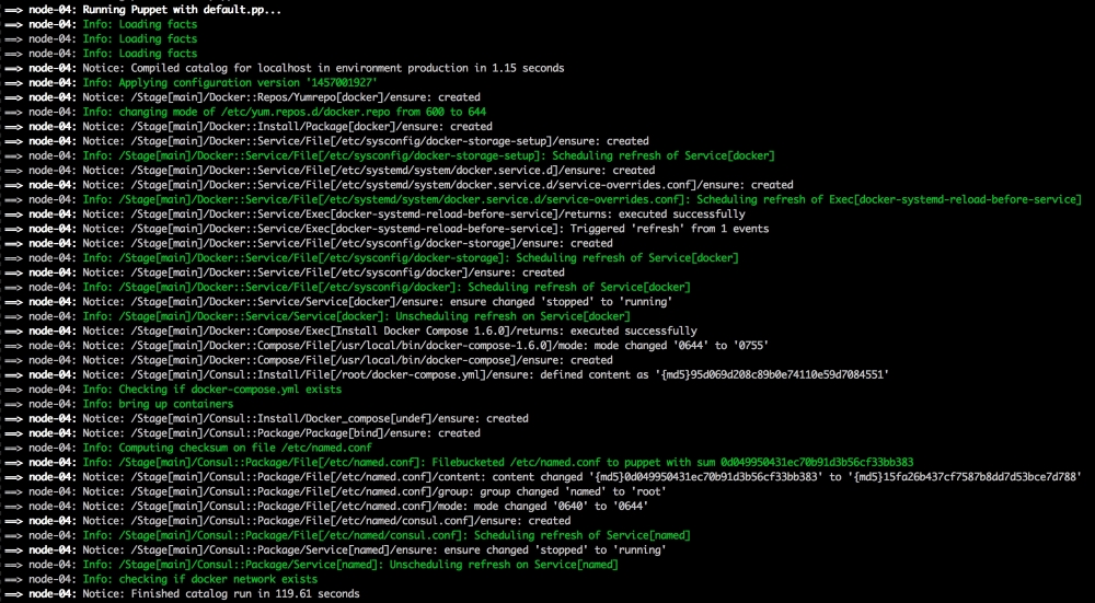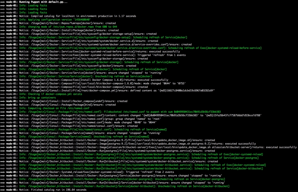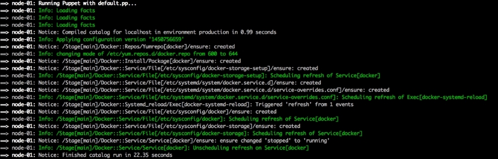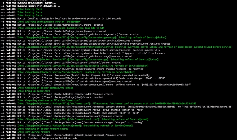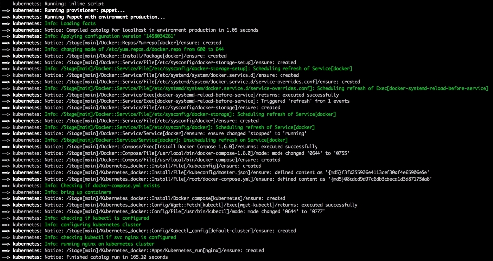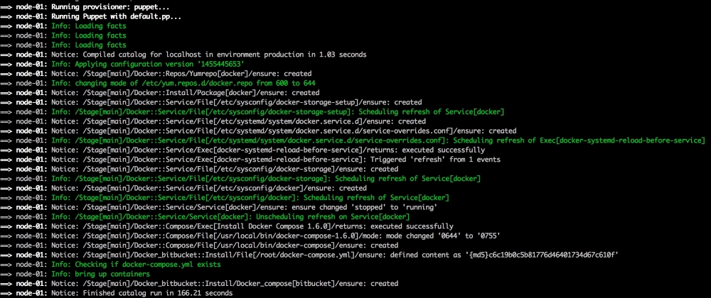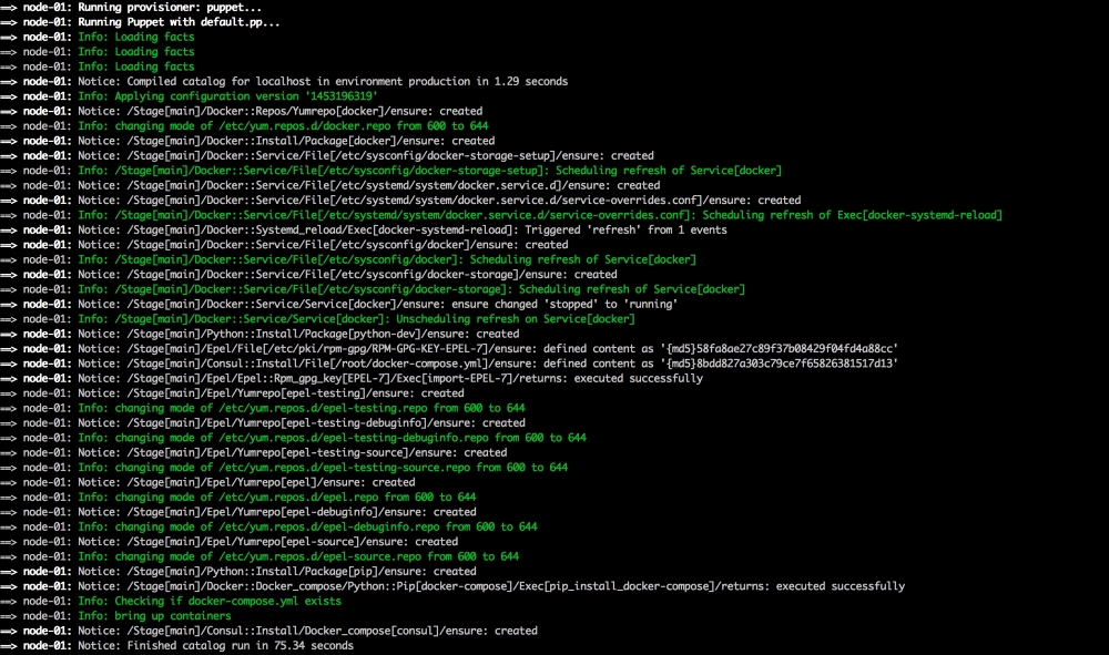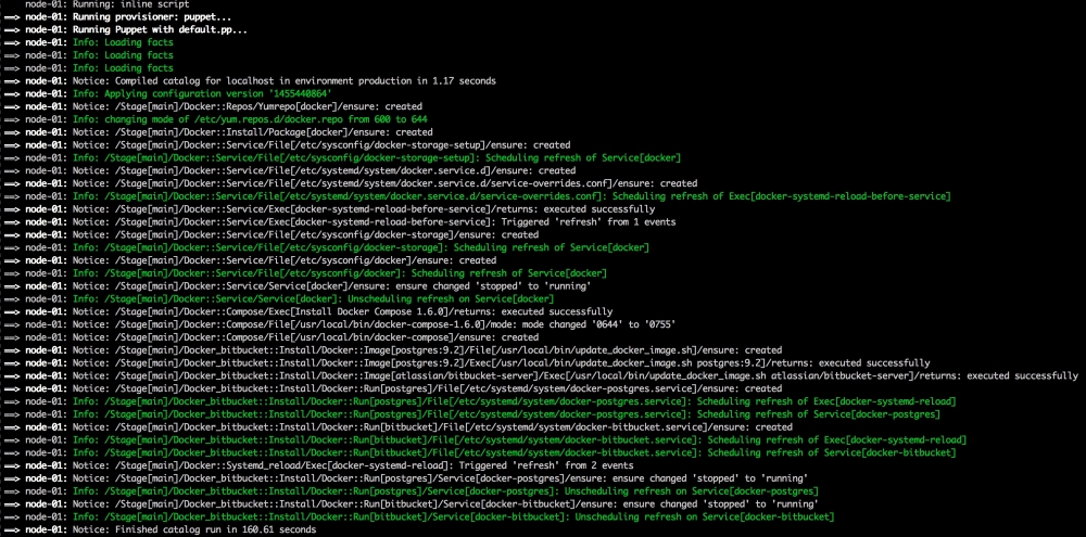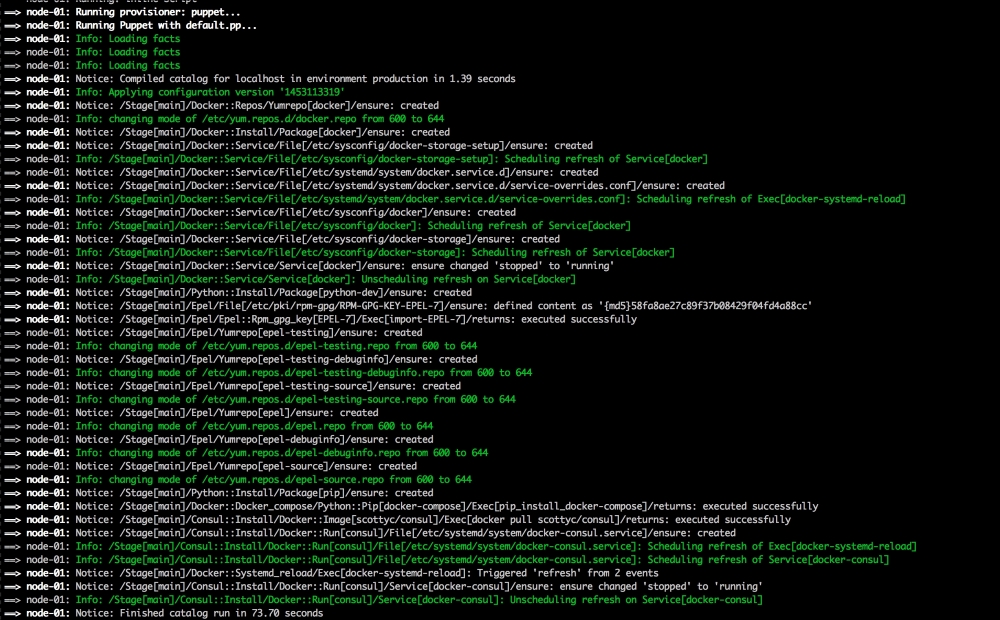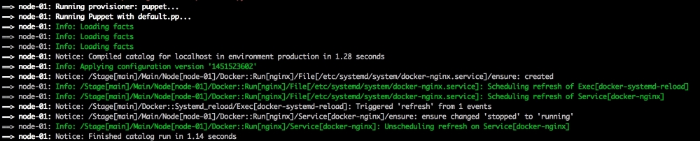 Now, let's open our terminal and change the directory to the root of our Vagrant repo and issue the vagrant up command. Once Puppet has completed its run, our terminal should look like the following screenshot: