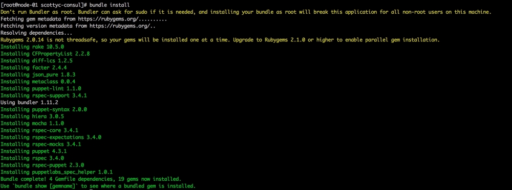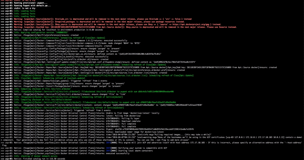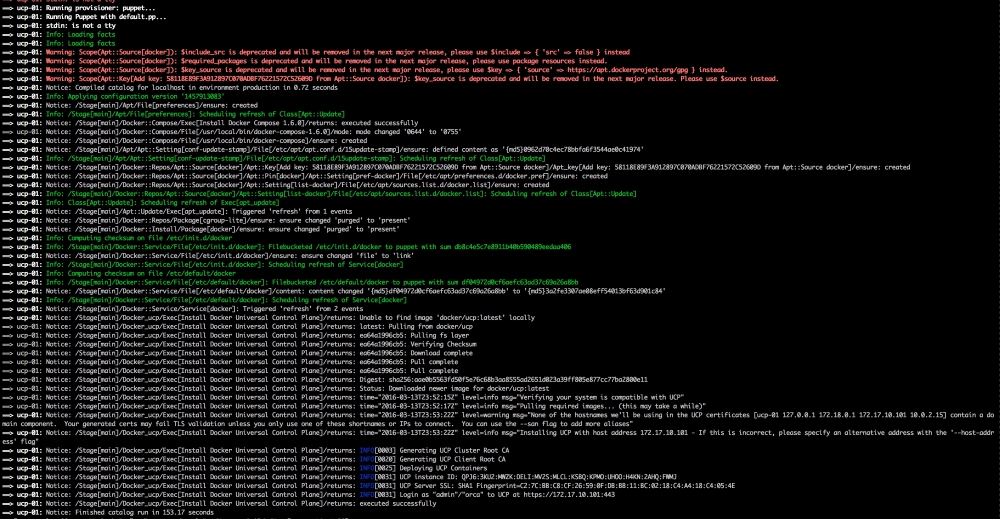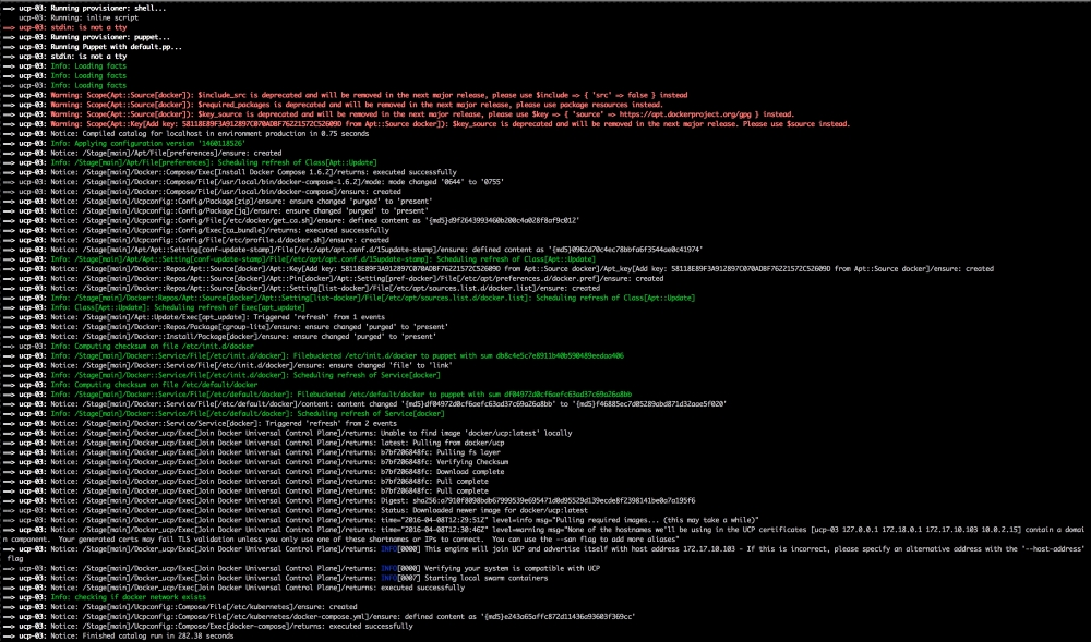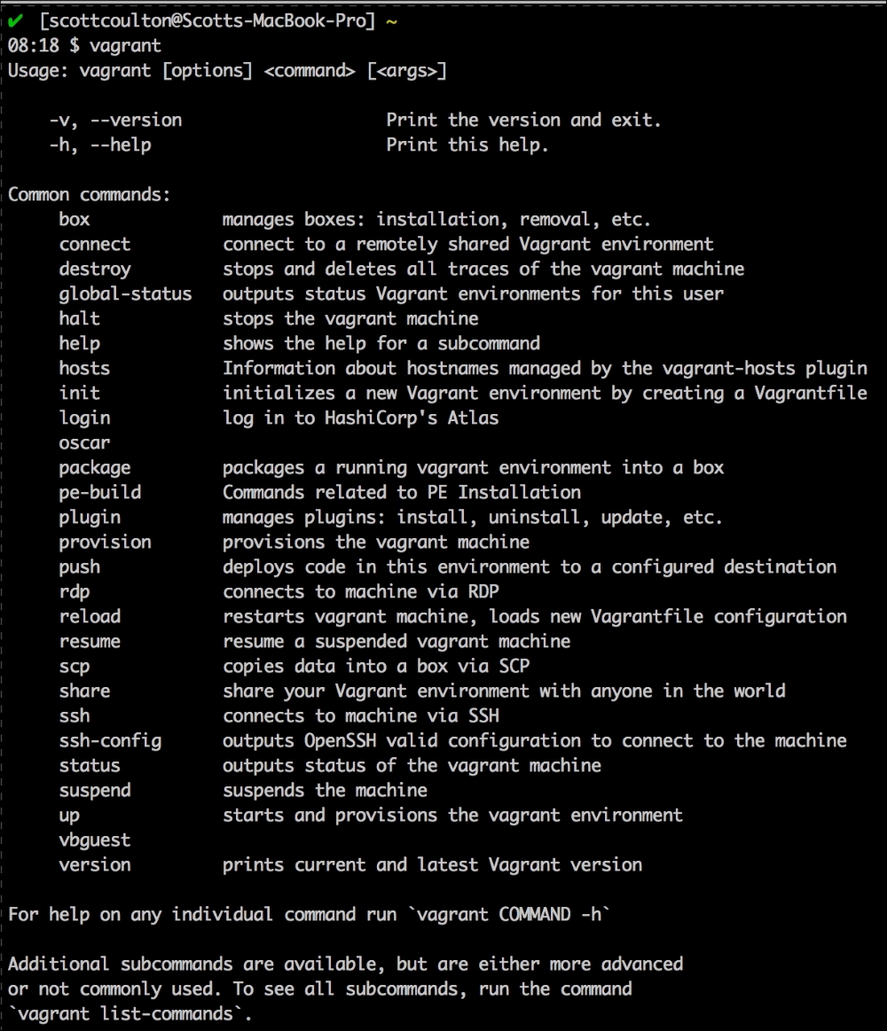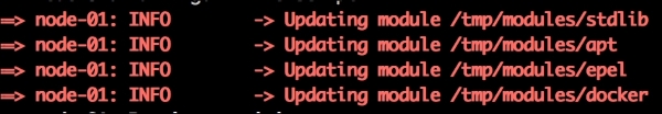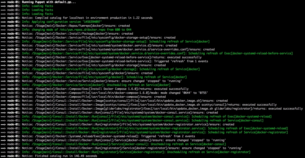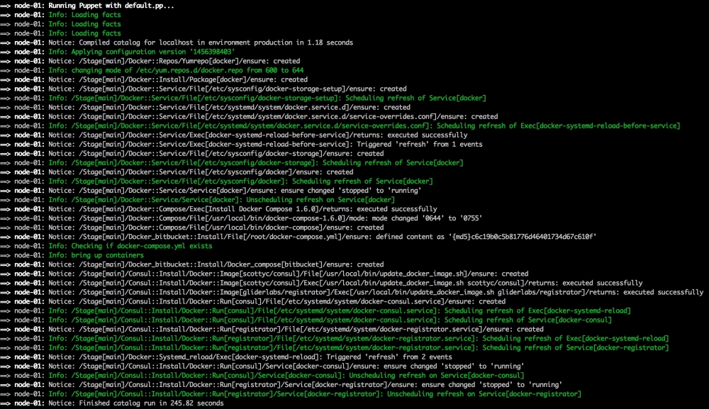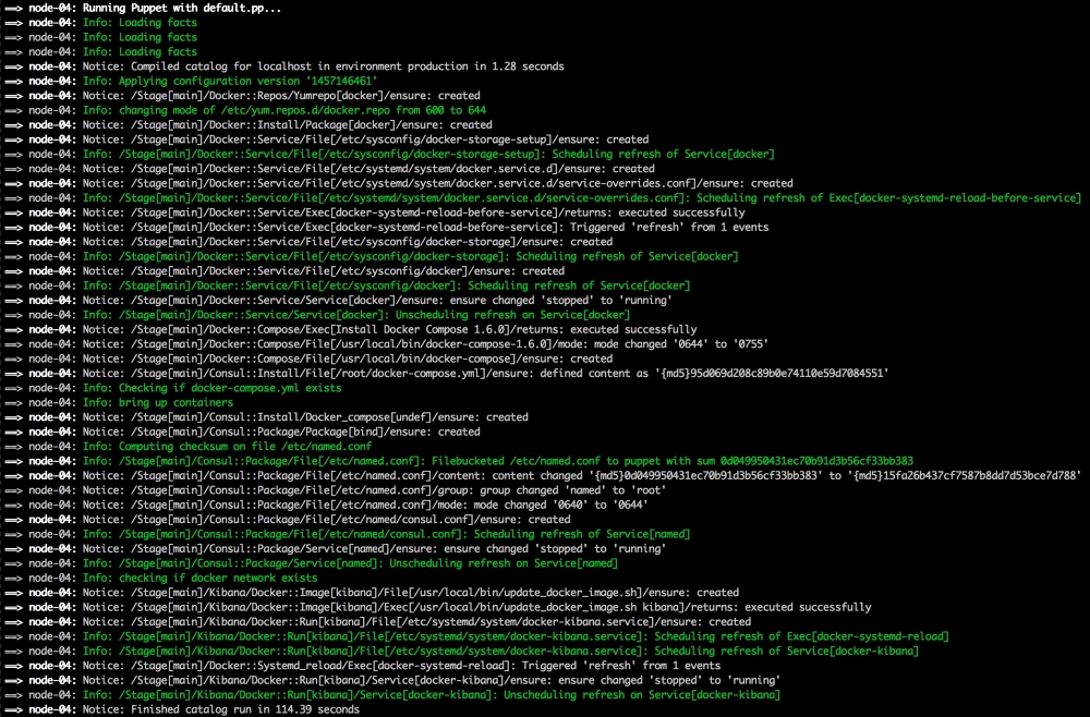 Now, let's open our terminal and change the directory to the root of our Vagrant repo and issue the vagrant up command. Once Puppet has completed its run, our terminal should look like the following screenshot: