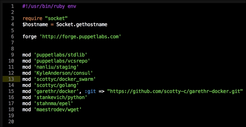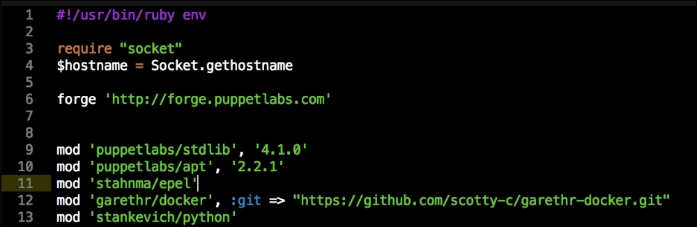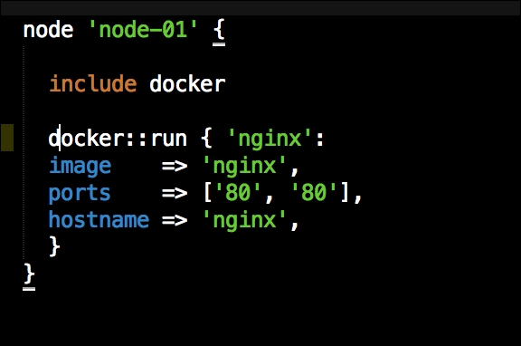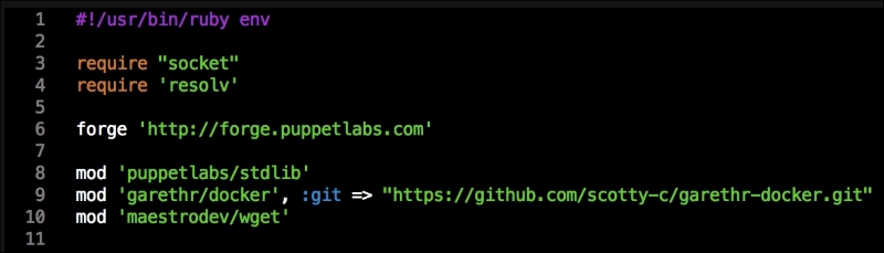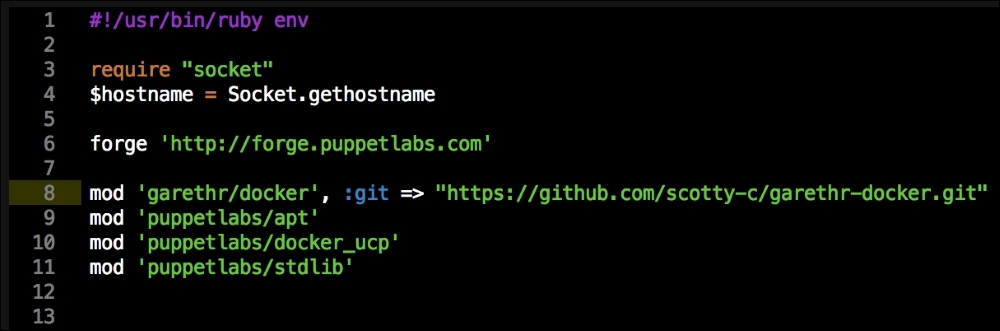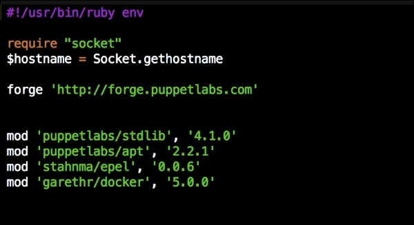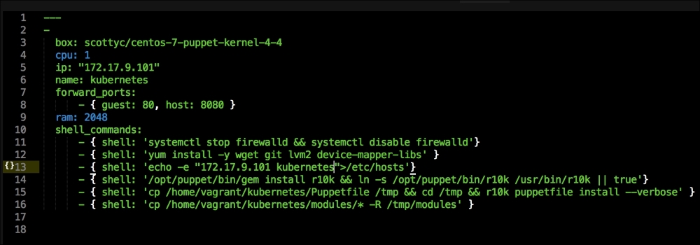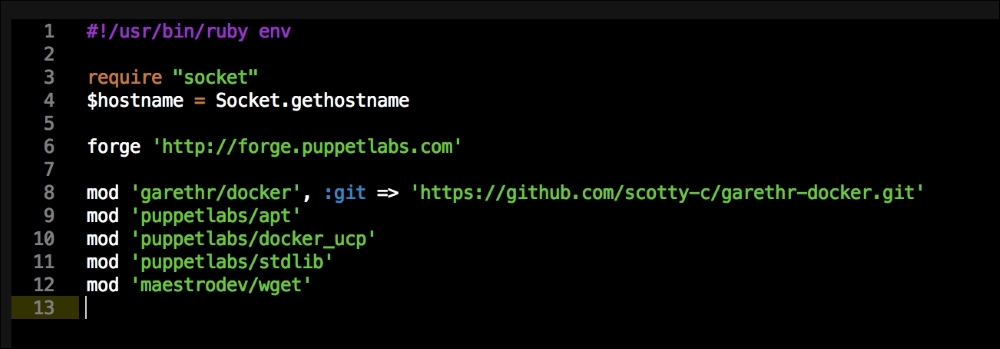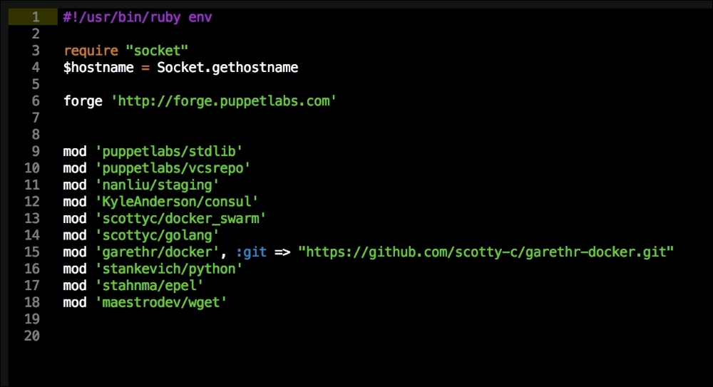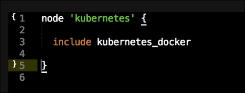 As you can see, there is nothing special there that we have not covered in this book. There's just a single node that we mentioned earlier, kubernetes. The next file we will look at is our Puppetfile. We will, of course, need our Docker module, stdlib, and lastly, wget. We need wget to get kubectl: