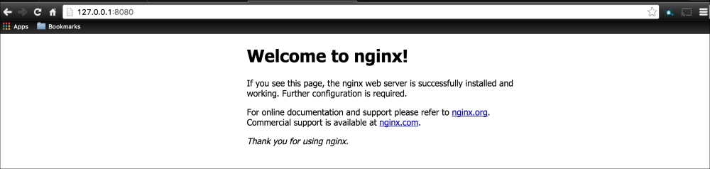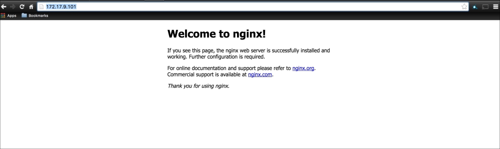 As you can see, we have two services running our cluster: Kubernetes and nginx. If we go to our web browser and go to the address we gave to the second network interface, http://172.17.9.101, we will get the following nginx default page: