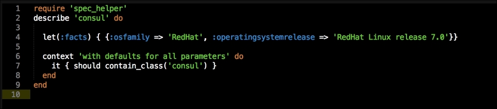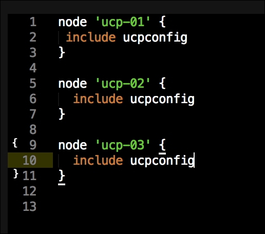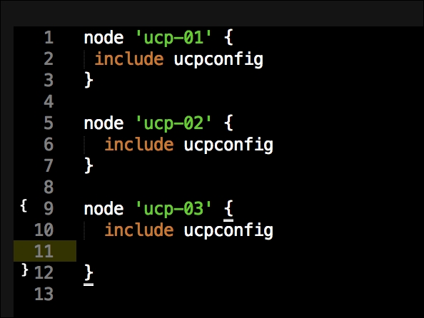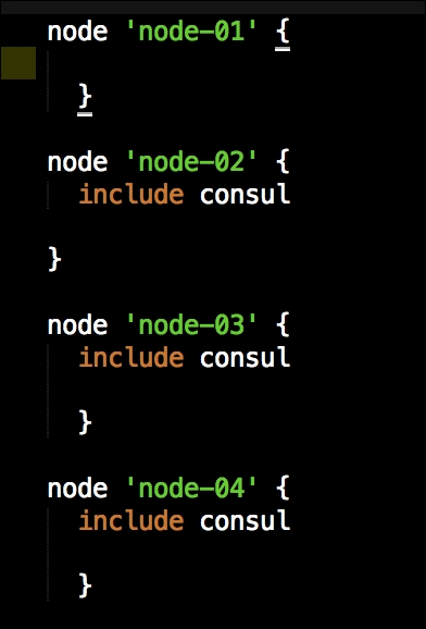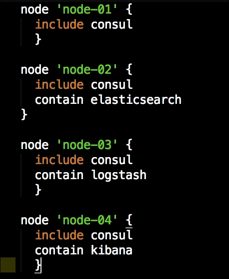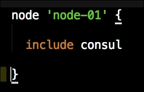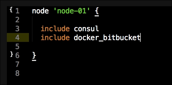 Now we have all our coding done. We just need to add our class to our node by editing our default.pp file in the manifests folder in the root of our Vagrant repo as follows: