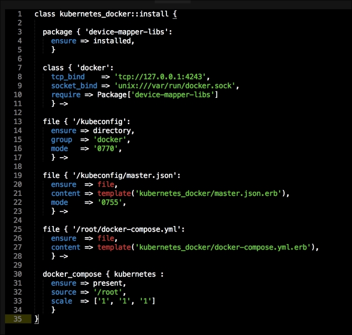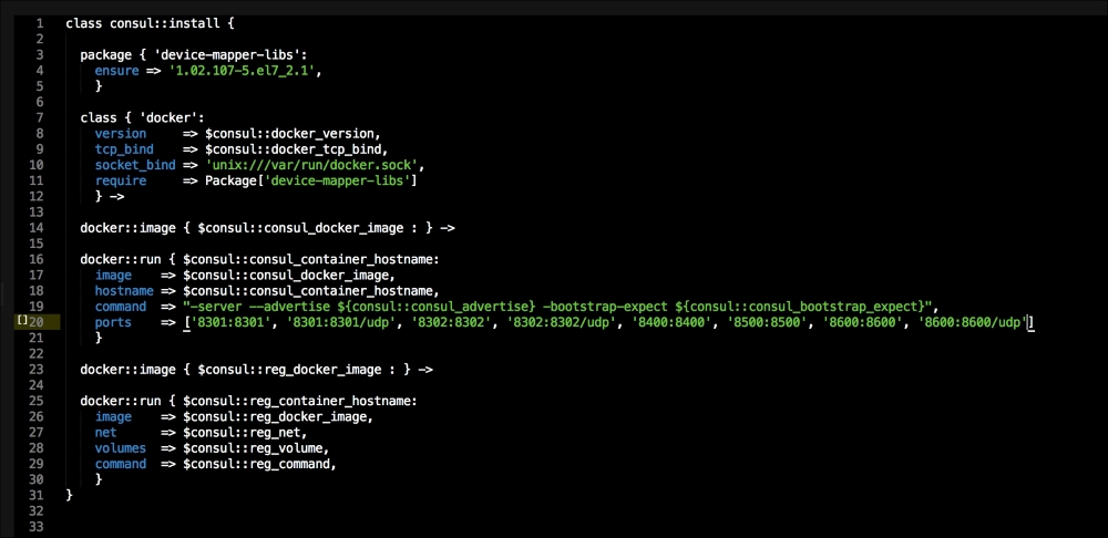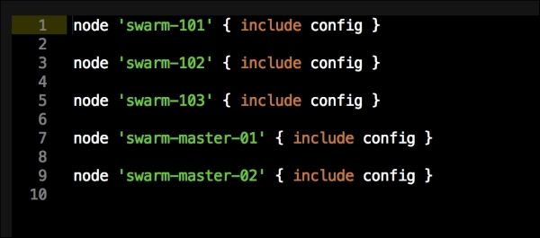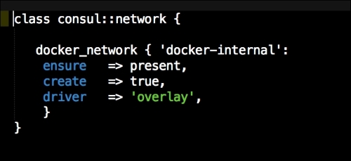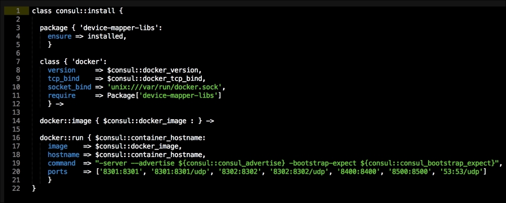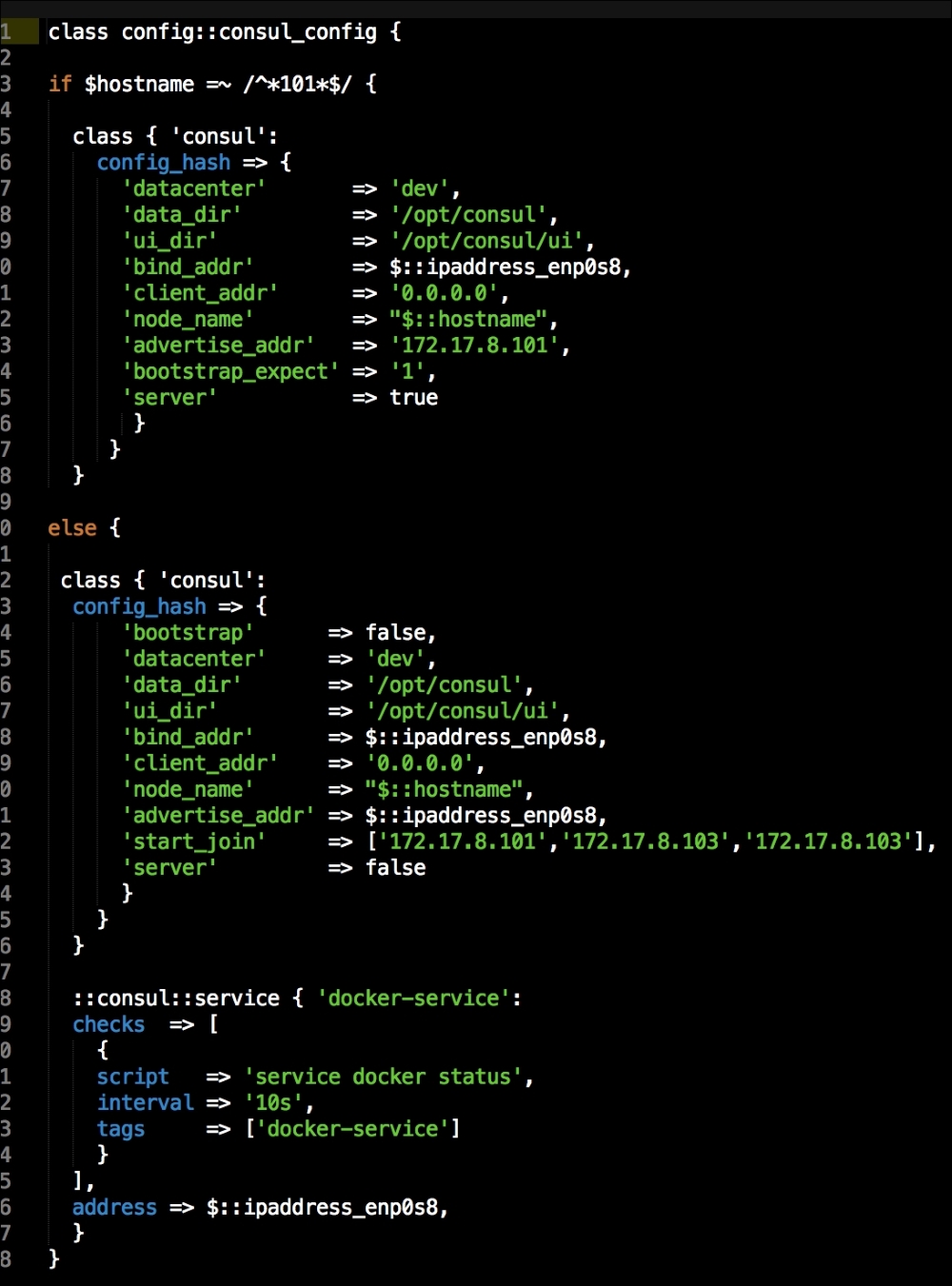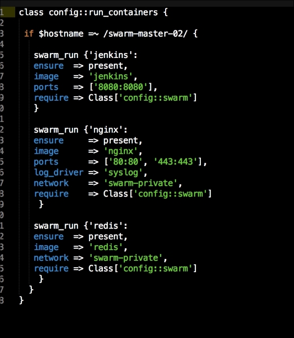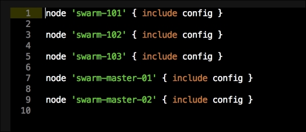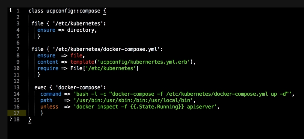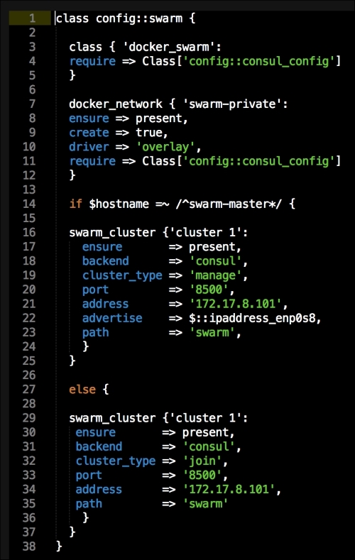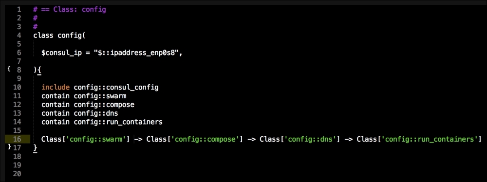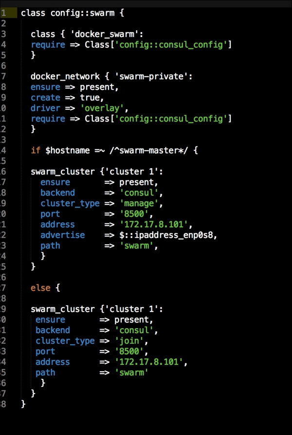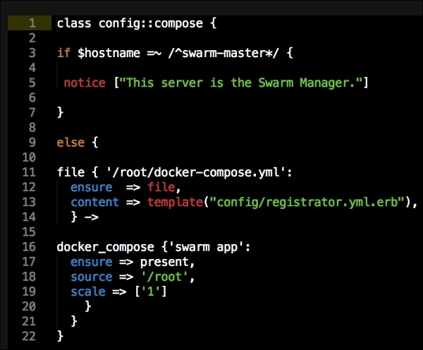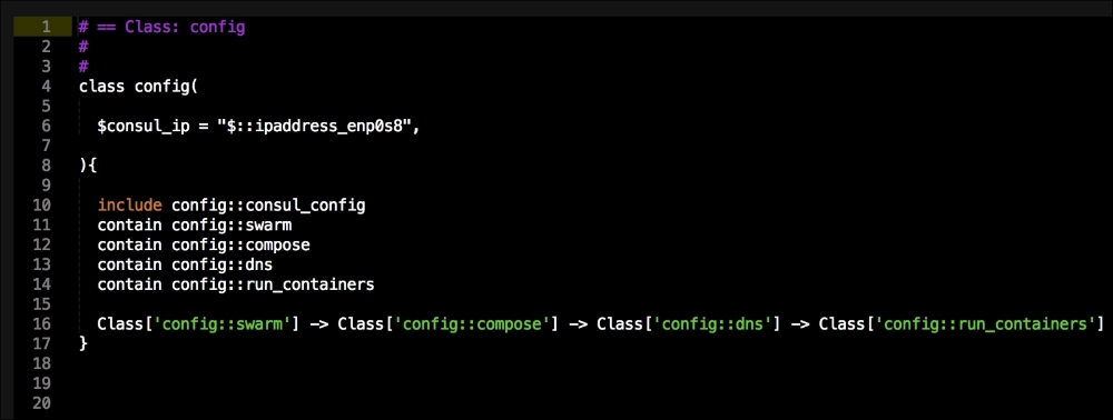 In this file, we install Docker as we did before. We will place our two templates that we created earlier. Then, we will run Docker Compose to bring up our cluster. Now, we will move on to config.pp, as follows: