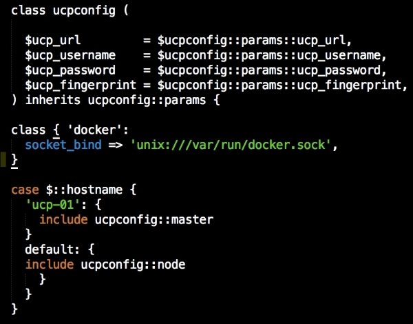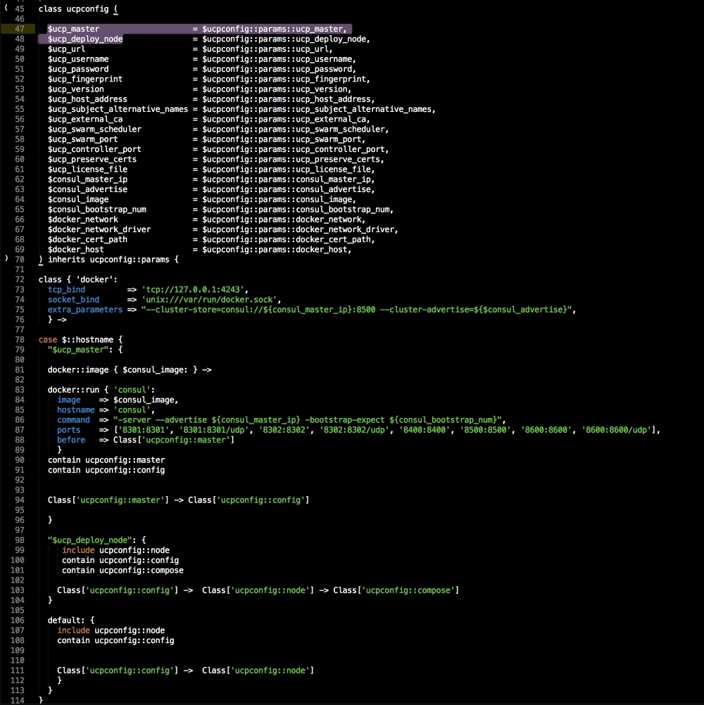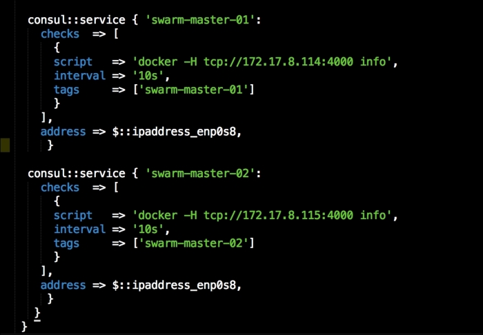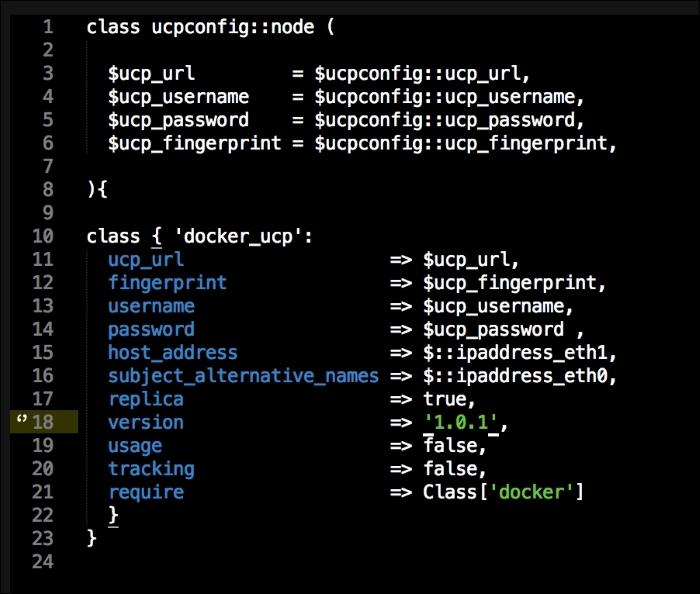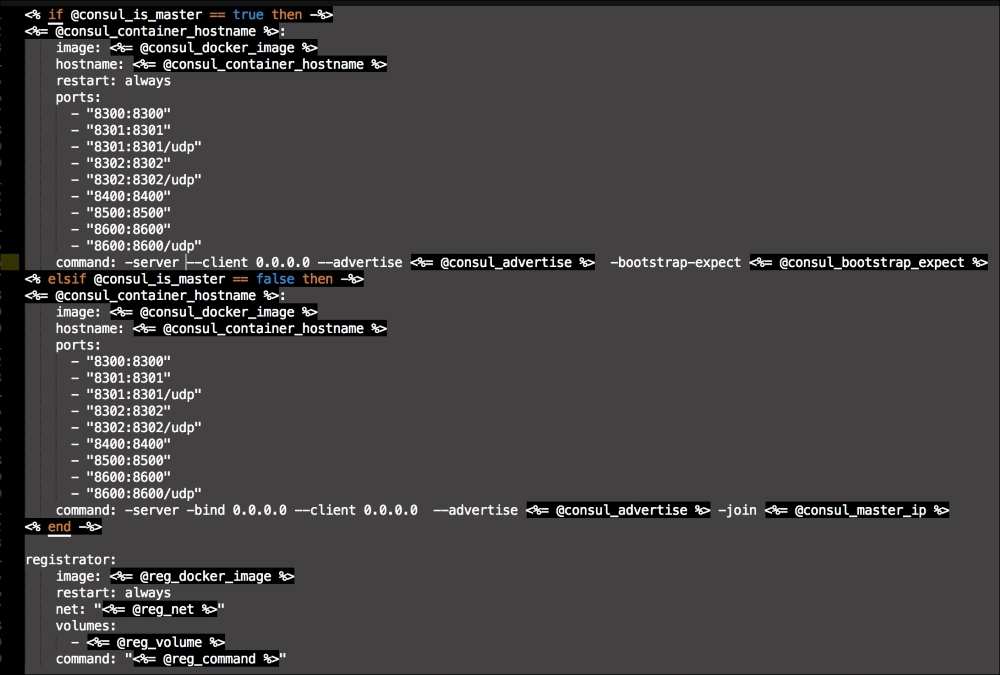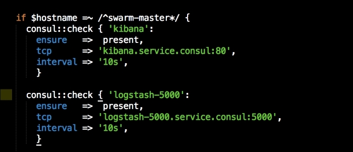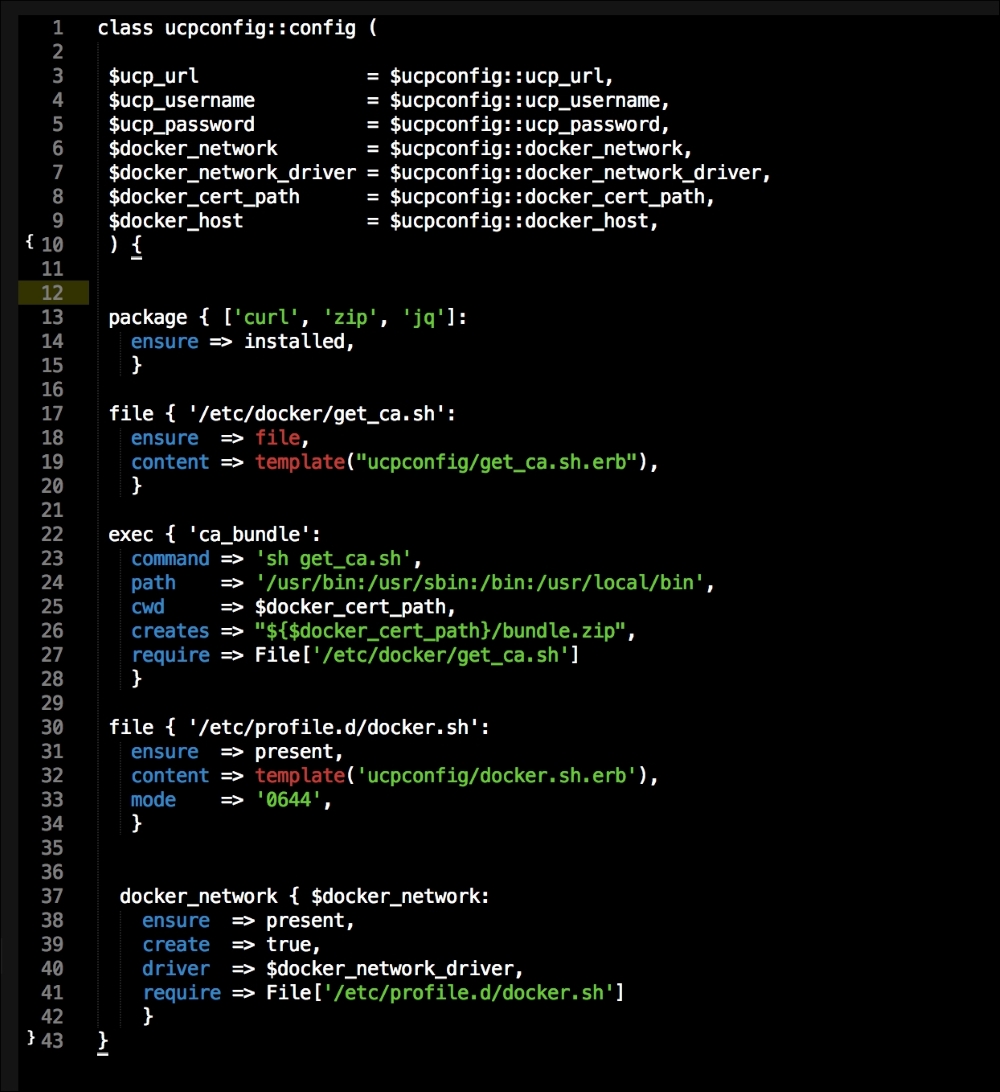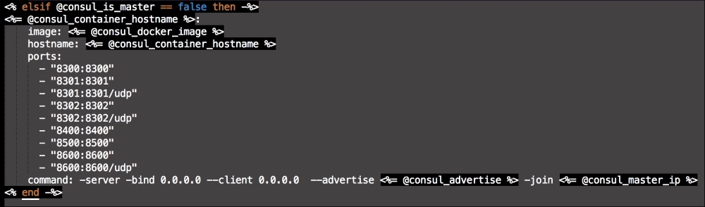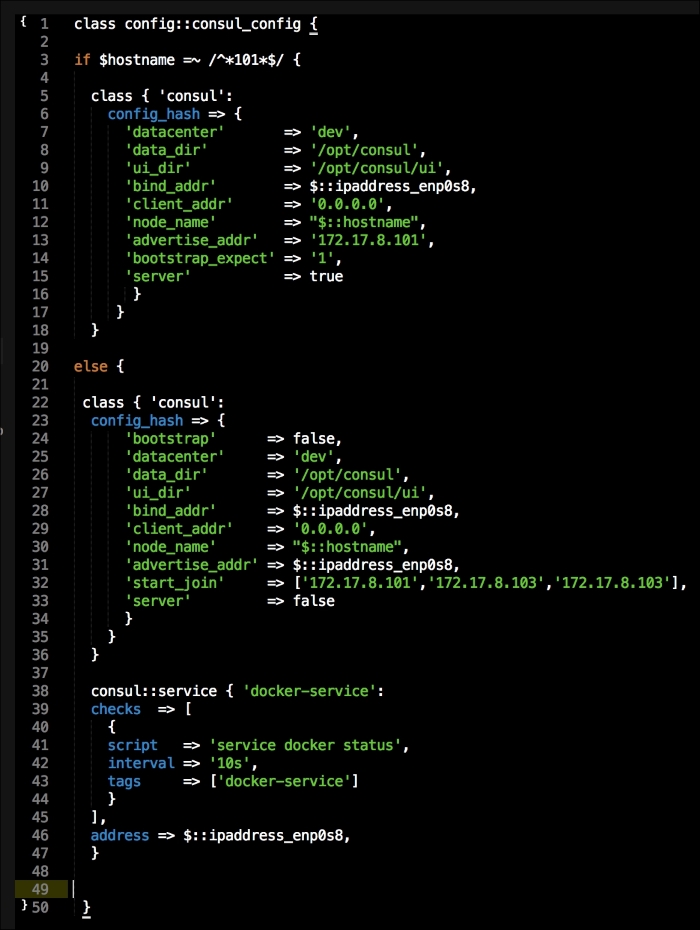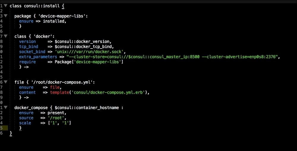 In this file, we install Docker as we did before. We will place our two templates that we created earlier. Then, we will run Docker Compose to bring up our cluster. Now, we will move on to config.pp, as follows: