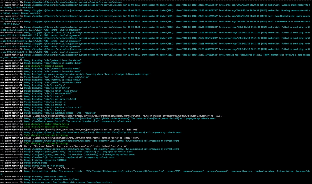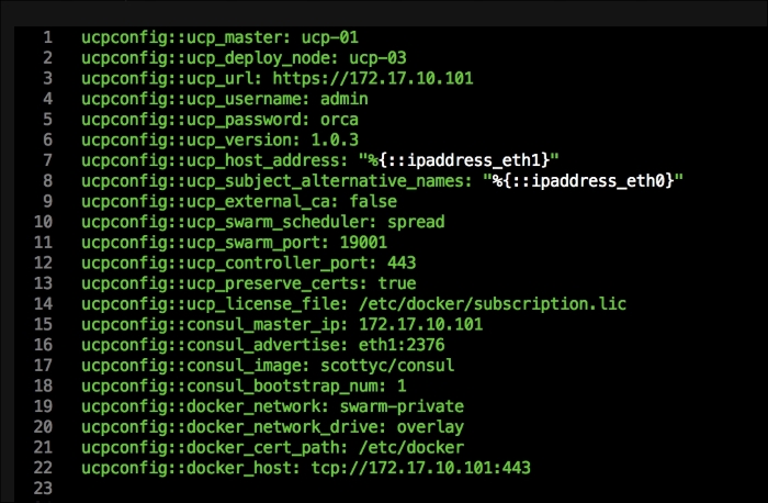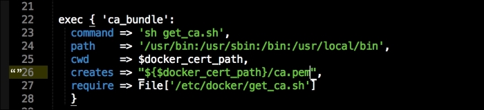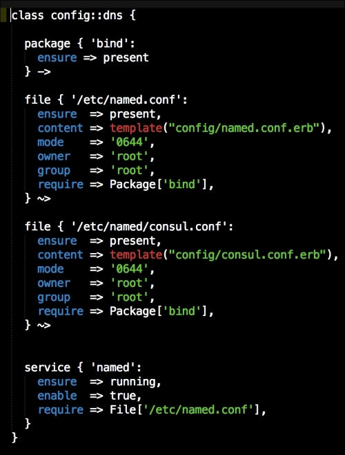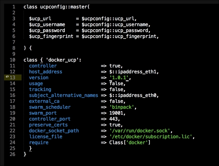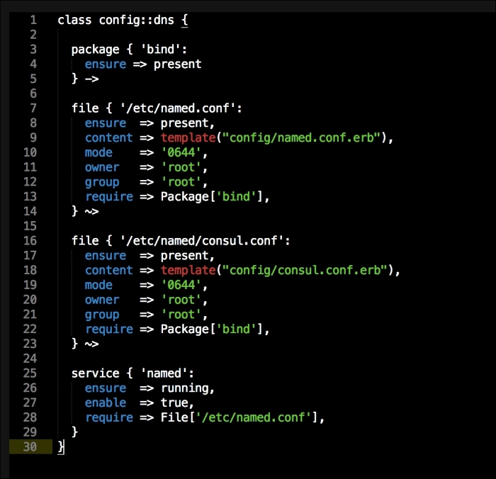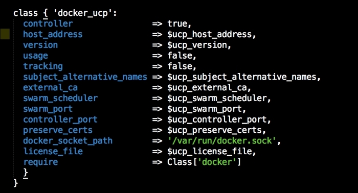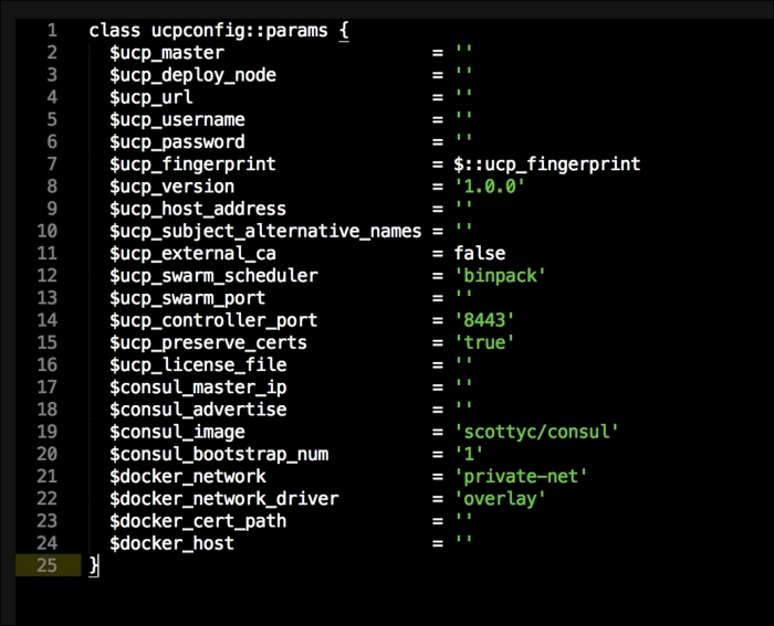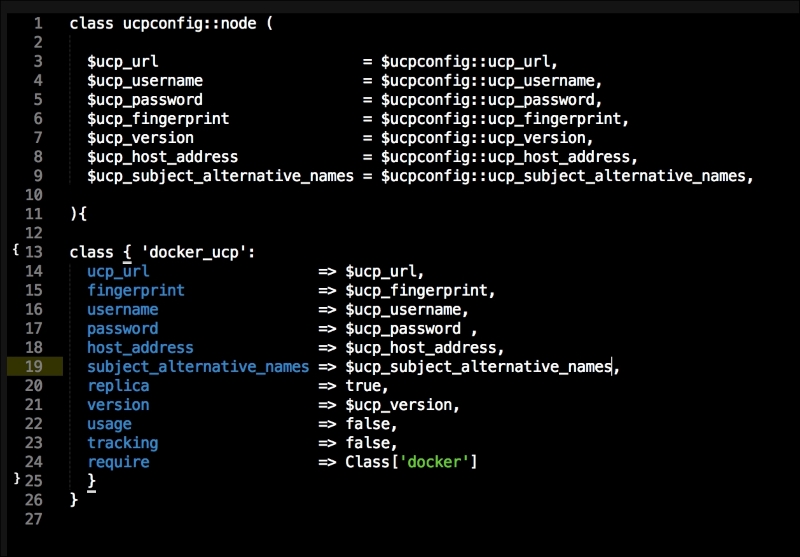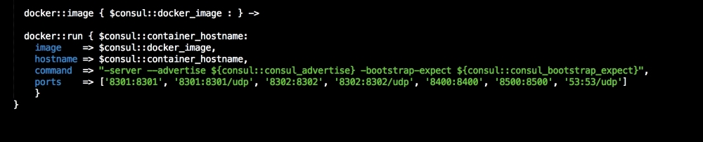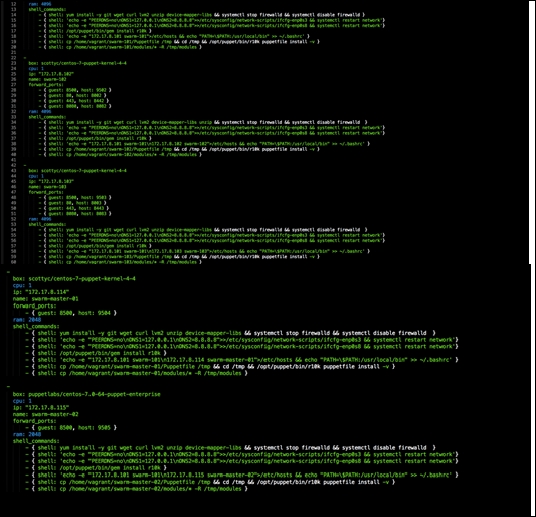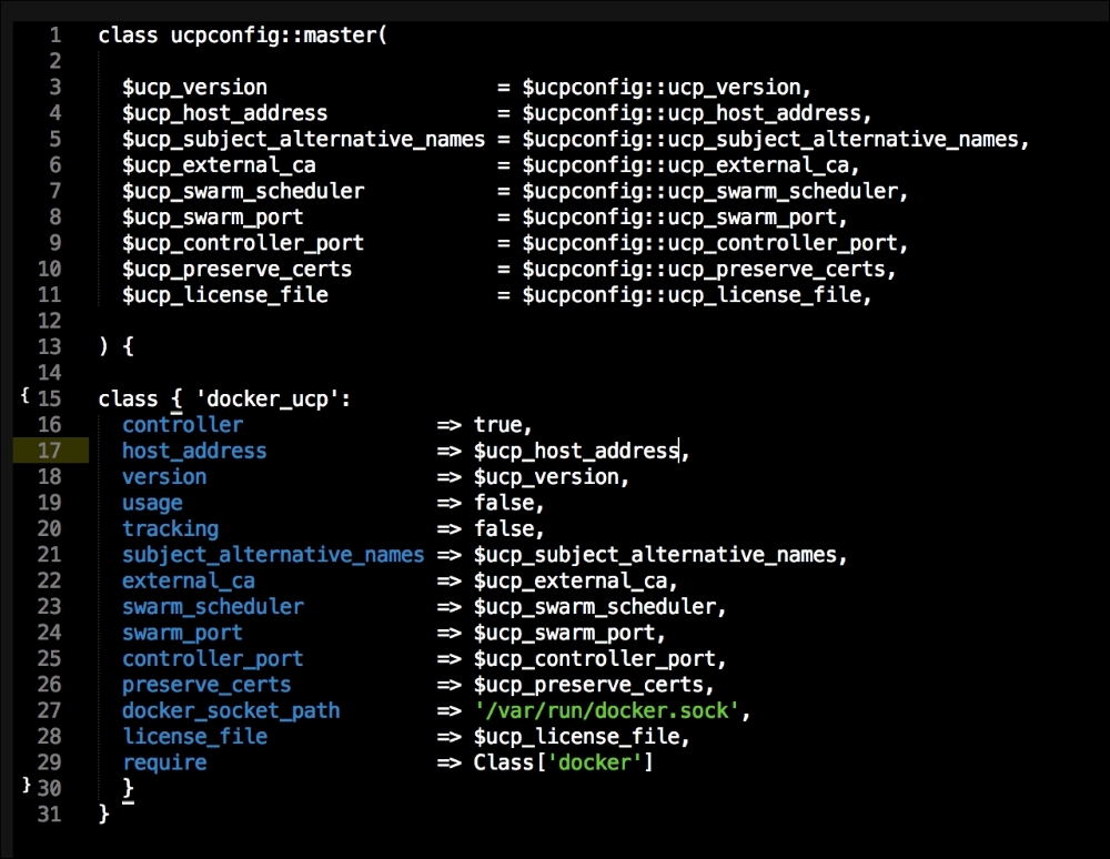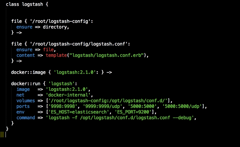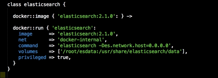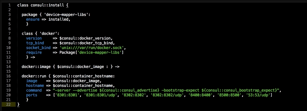 In this file, we install Docker as we did before. We will place our two templates that we created earlier. Then, we will run Docker Compose to bring up our cluster. Now, we will move on to config.pp, as follows: