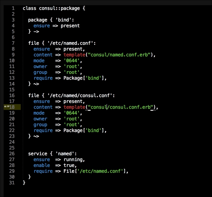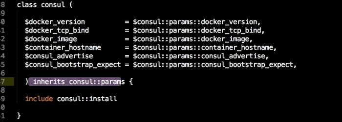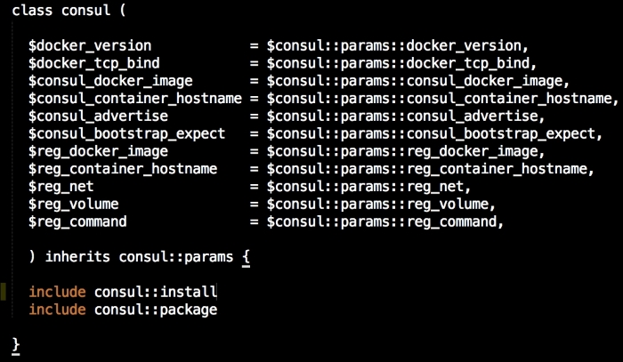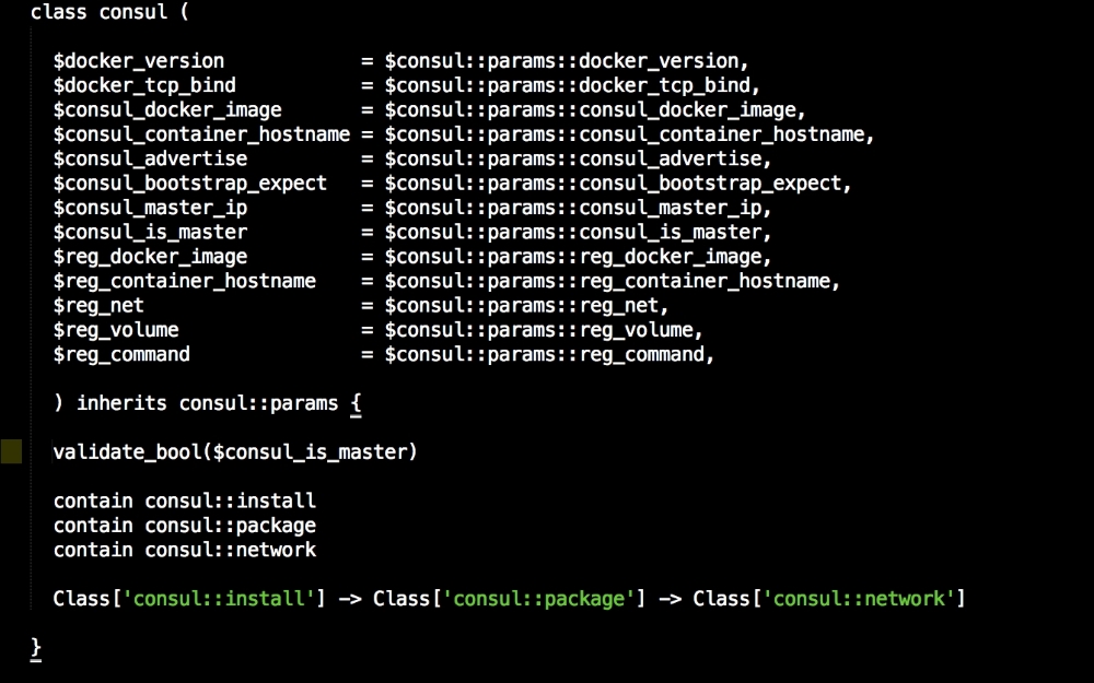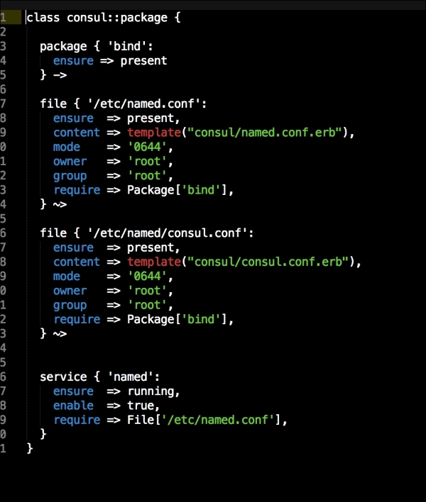 As you can see, there is not much in this file. We are going to use our init.pp file to control the order in which classes are executed. We are also declaring param <%= @master_ip %>. We will now move on to our install.pp file, as follows: