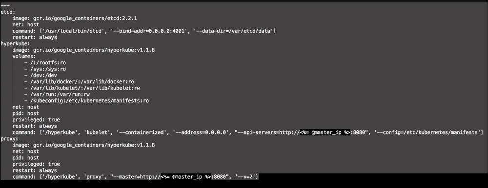 The next container we create is hyperkube. Again, it is an official Google image. Now, we are giving this container access to a lot of host volumes, the host network, and the host process, making the container privileged. This is because the first container will bootstrap Kubernetes and it will spawn more containers running the various Kubernertes components. Now, in the command resource, we are again passing some arguments for hyperkube. The two major ones we need to worry about are the API server address and config manifests. You will note that we have a mapped folder from /kubeconfig:/etc/kubernetes/manifests:ro. We are going to modify our manifest file to make our Kubernetes environment available to the outside world. We will get to that next. But, we will finish looking at the code in this file first.