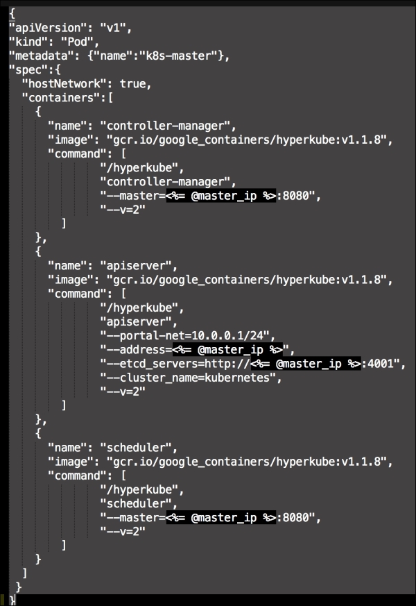 The last container and the third block of code is going to set up our service proxy. We are going to give this container access to the host network and process. In the command resource, we are going to specify that this container is a proxy. The next thing to take notice of is that we specify where the proxy can find the API. Now, let's create the next file, master.json.erb. This is the file that hyperkube will use to schedule all the Kubernetes components, which are as follows: