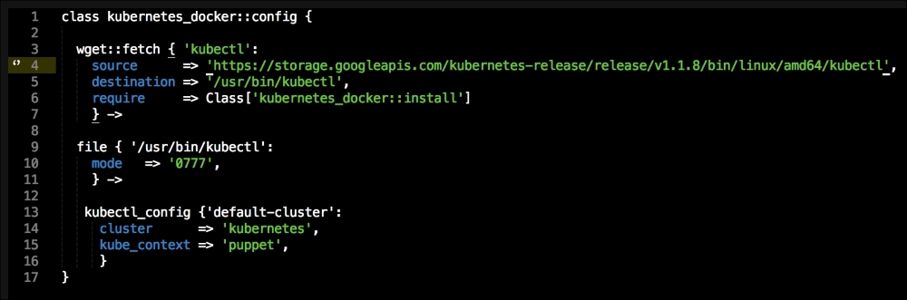 The first thing that we declare is that we want wget to be our kubectl client, and we place it at /usr/bin/ (http://kubernetes.io/docs/user-guide/kubectl/kubectl/). You really need to understand what this interface does; otherwise, you might get a bit lost from here. So, I suggest that you have a fairly good idea of what kubectl is and what it is capable of. Next, we will make it executable and available for all our users. Now, this last piece of code does not make sense, as we have not called the kubectl_config class yet: