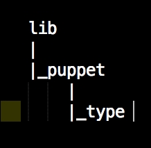 We now need to jump to our lib directory. This first thing we will do is create all our folders that we need. The first folder that we will create is puppet under the lib directory. We will look at our custom types first. We will create a folder called type under puppet. The following screenshot will give you a visualization of the structure:
