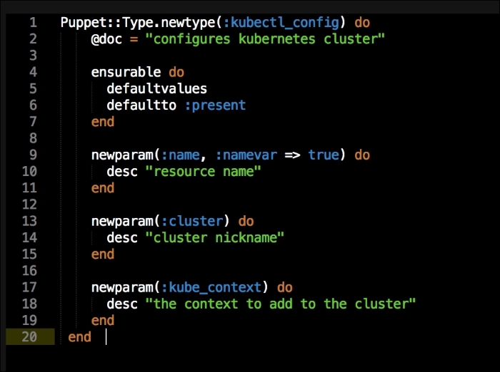 Let me explain what is happening here. In the first line, we are going to declare our new type, kubectl_config. We are then going to set the default value of the new type when it is declared as present. We are going to declare three values to our type, name, cluster, and kube_context. These are all settings that we will add to our config file that kubectl will use when we interface with it. Now, we will create a folder under the lib directory called provider. Then, under that, we will create a folder with the same name as our custom type, kubectl_config. Inside that folder, we will create a file called ruby.rb. In this file, we will put the Ruby code that provides logic to our type as follows: