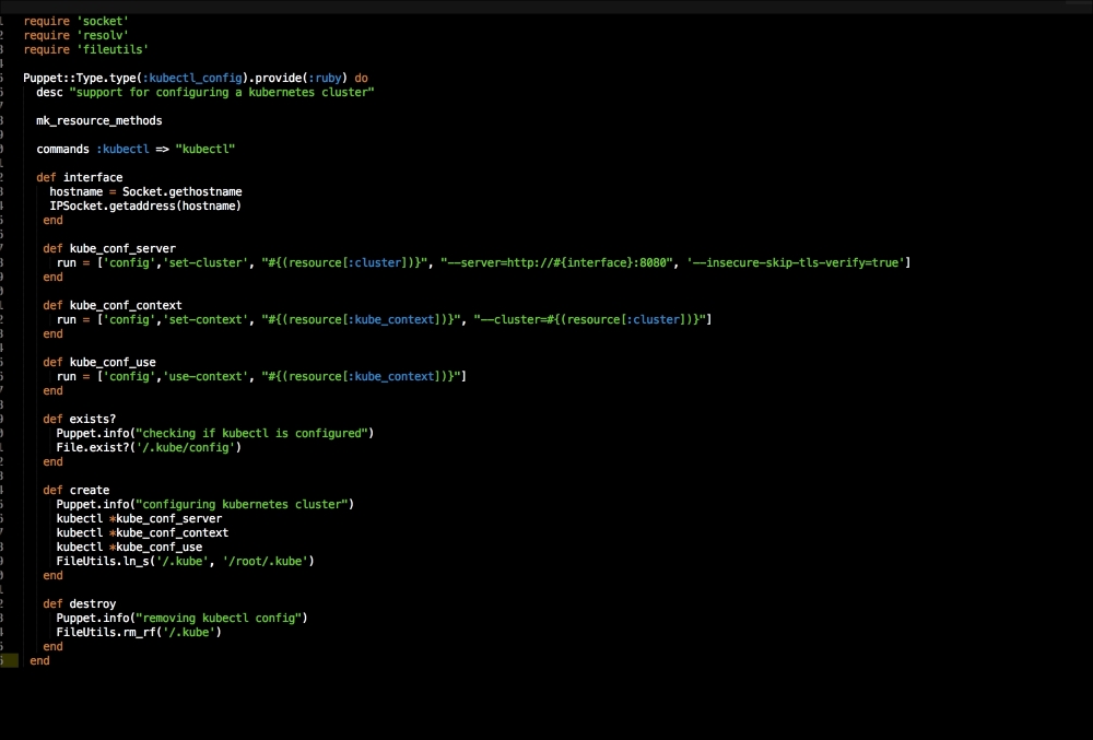 We are now going to work through the file, from top to bottom. We need to first load a few Ruby libraries for some of our methods. We will then tie this provider to our type. The next thing that we need to declare is the kubectl executable.
