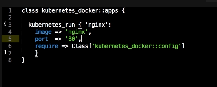We will now move on to our files in the modules manifest directory. Now, strap yourselves in, as this is where the magic happens. Well, that's not true. The magic happens here and in our lib directory. We will need to write some custom types and providers for Puppet to be able to control Kubernertes as kubectl is the user interface (for types, visit https://docs.puppetlabs.com/guides/custom_types.html, and for providers, visit https://docs.puppetlabs.com/guides/provider_development.html).