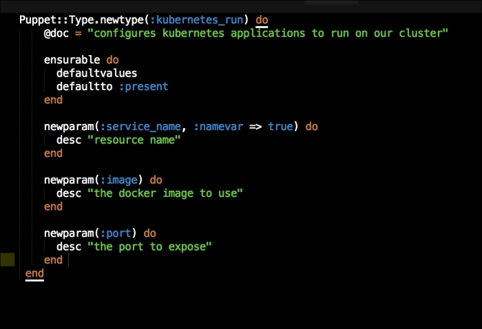 As you can see, we are mapping the same parameters that we had in our apps.pp file. We will then create a folder under the provider folder with the same name as our kubernetes_run type. Again, in the newly created directory, we will create a file called ruby.rb. It will have the code shown in the following screenshot: