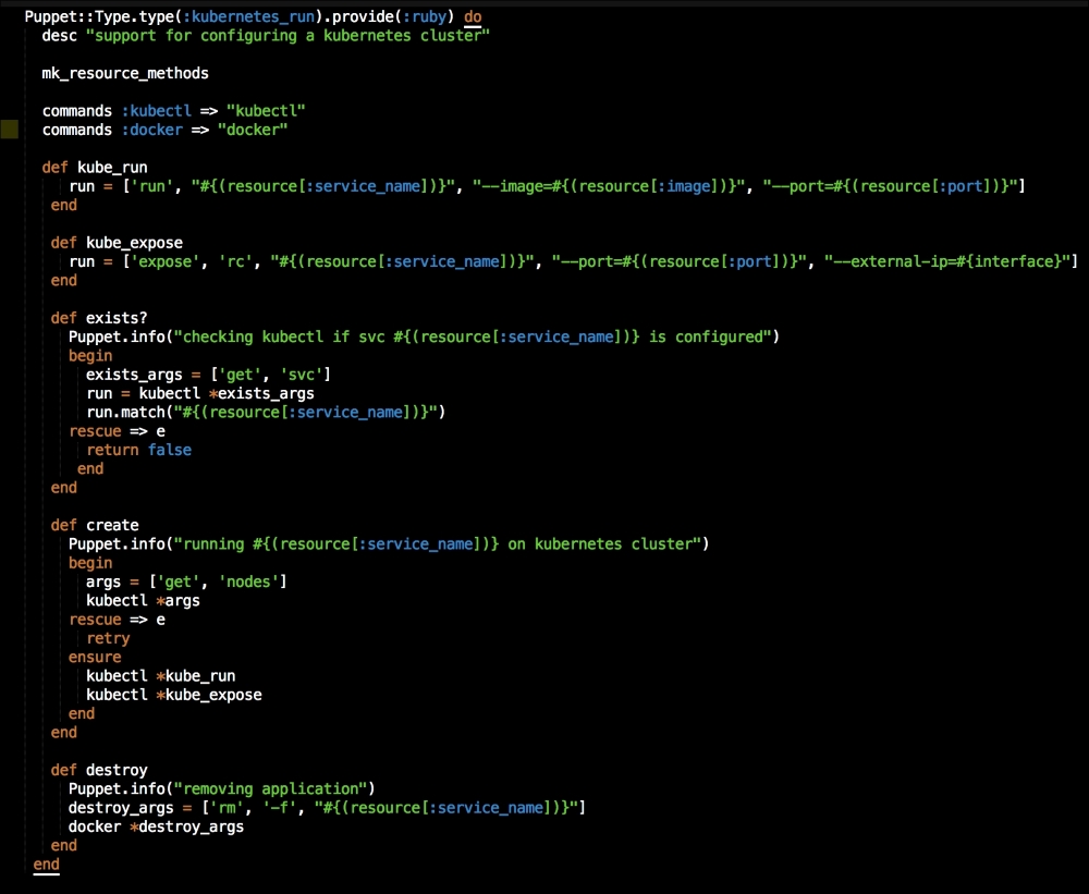 A provider needs to have three methods for Puppet to be able to run the code. They are exsists?, create, and destroy. These are pretty easy to understand. The exists? method checks whether the type has already been executed by Puppet, create runs the type, and destroy is invoked when the type is set to absent.