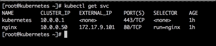 We will now log in to our vagrant box by issuing the vagrant ssh command and then sudo -i and change to root. Once we are root, we will look at our service on our cluster. We will do this by issuing the kubectl get svc command as follows: