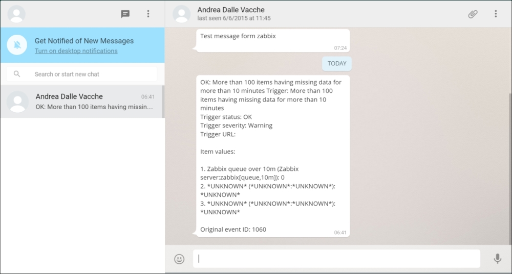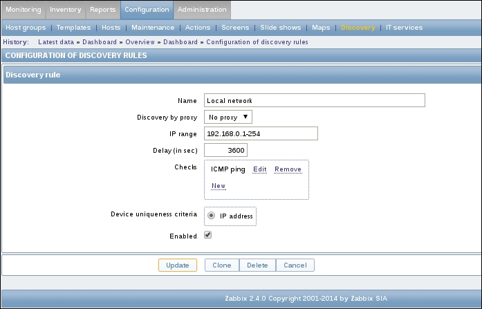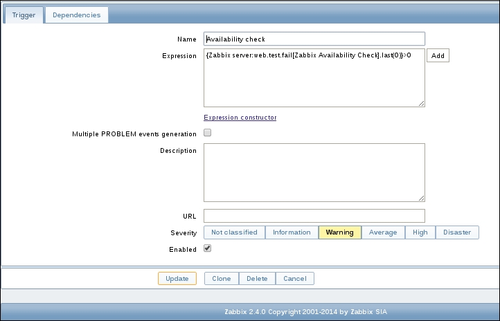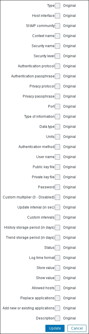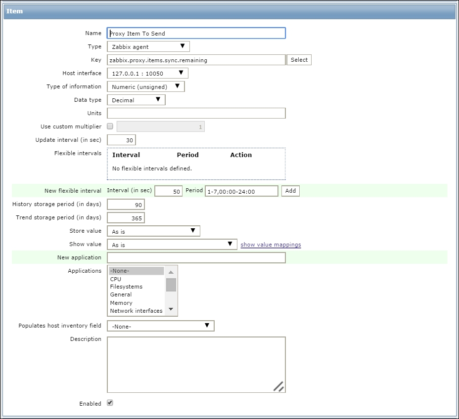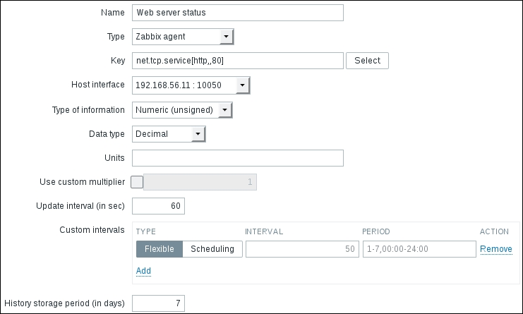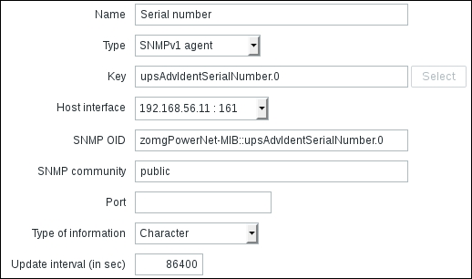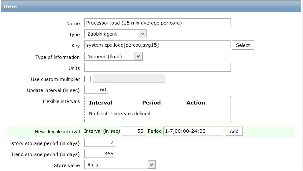 Secondly, we entered a very large update interval, 86400, which is equivalent to 24 hours. While this might seem excessive, remember what we will be monitoring here—the Zabbix agent version, so it probably (hopefully) won't be changing several times per day. Depending on your needs, you might set it to even larger values, such as a week.