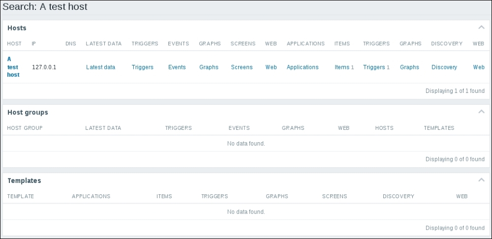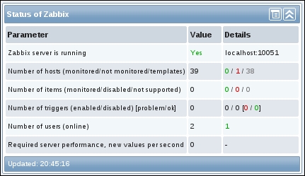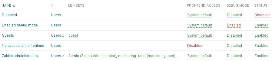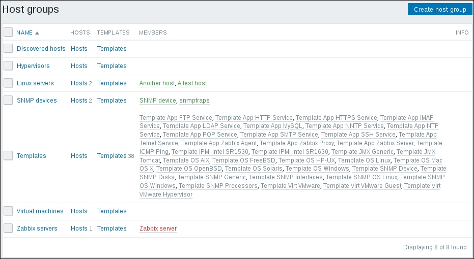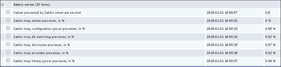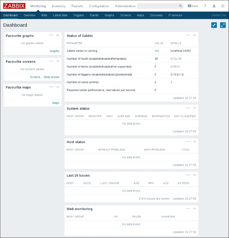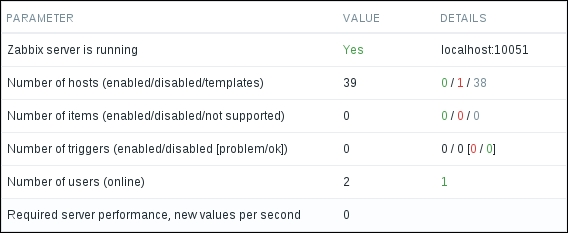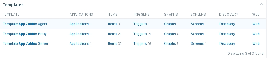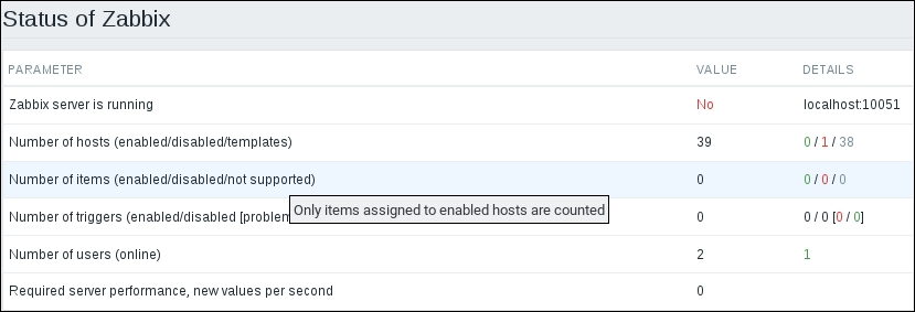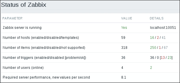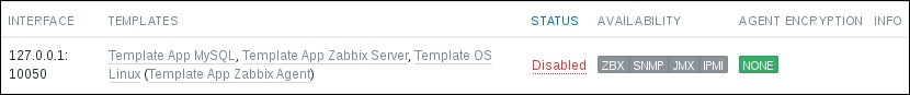 The three additional entries represent the SNMP, JMX, and IPMI data-gathering statuses. We will monitor SNMP devices in Chapter 4, Monitoring SNMP Devices, IPMI devices in Chapter 16, Monitoring IPMI Devices, and JMX applications in Chapter 17, Monitoring Java Applications.