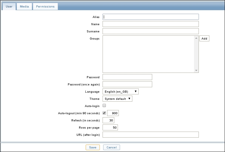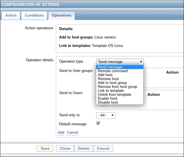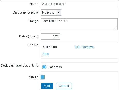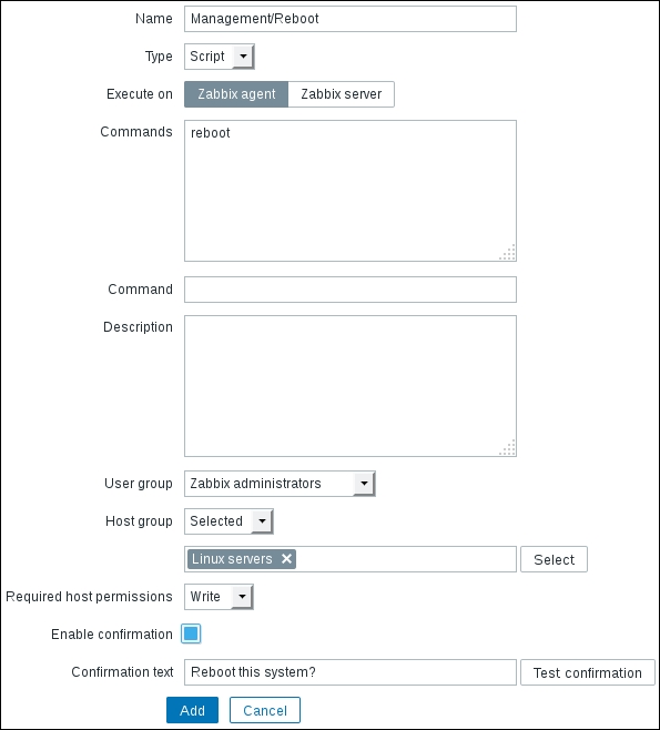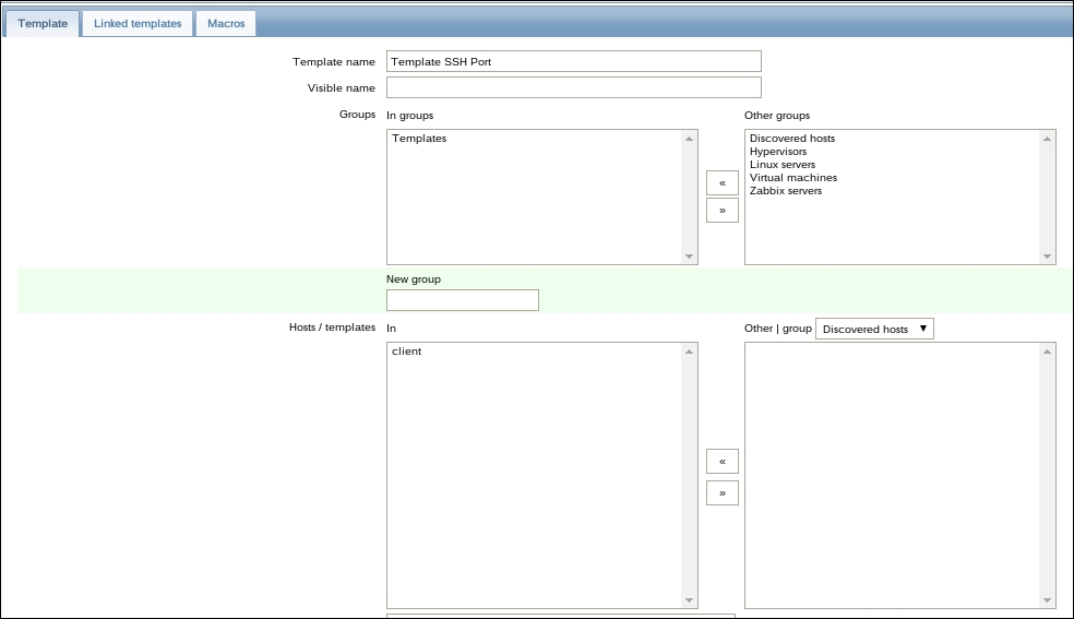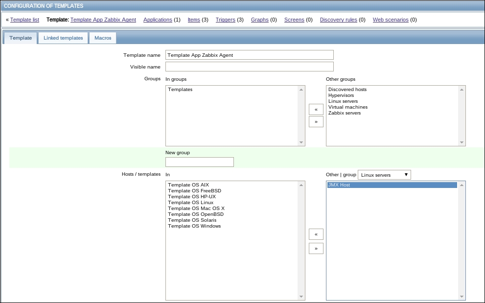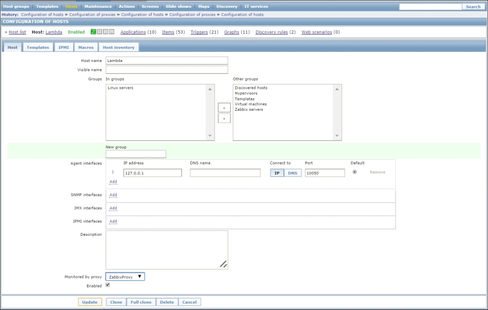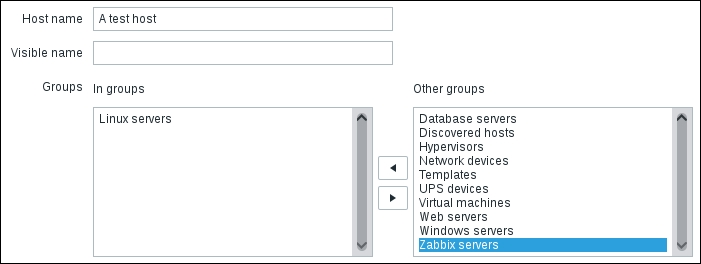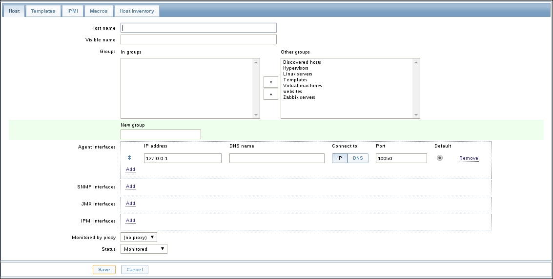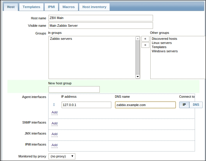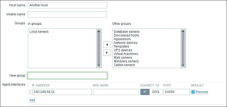 Once the agent has been started, we also have to add this new host to the configuration, so go to Configuration | Hosts. Make sure that the Group dropdown in the upper-right corner says Linux servers. Click on the Create host button and fill in this form: