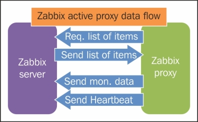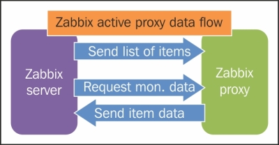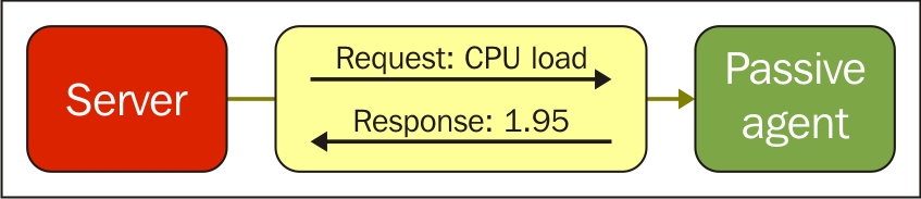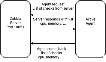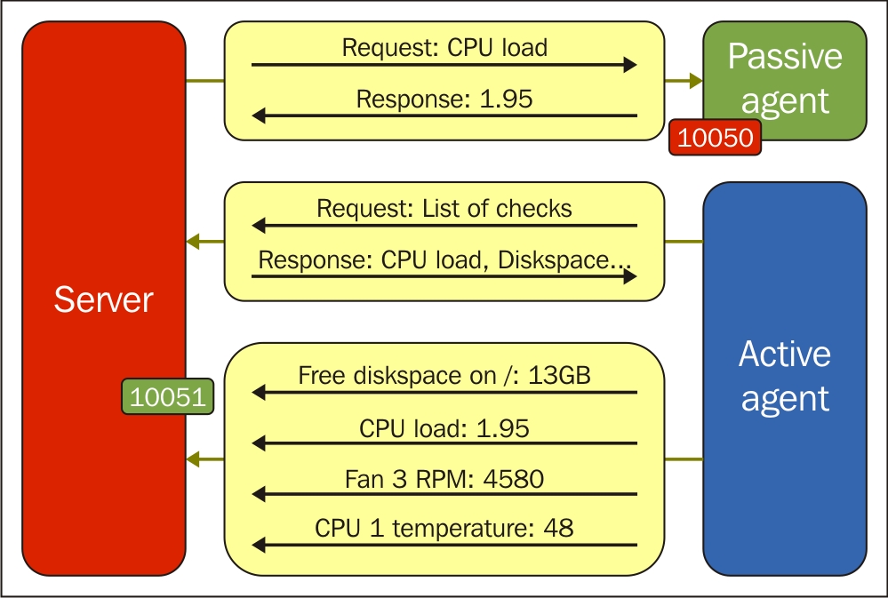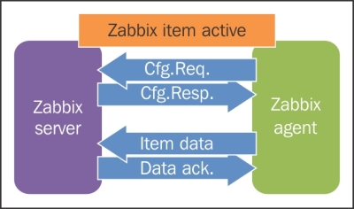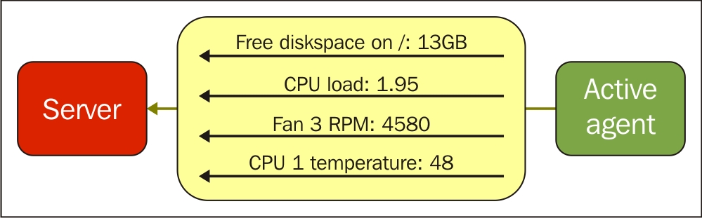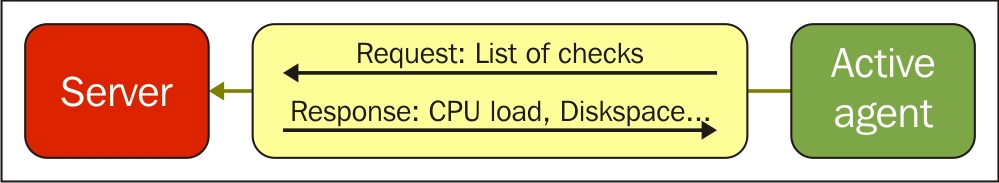 One value means one connection. An active agent is a bit more complicated. Remember: in the active mode, the agent connects to the server; thus, the agent first connects to the Zabbix server and asks for a list of items to be monitored. The server then responds with items, their intervals, and any other relevant information: