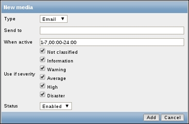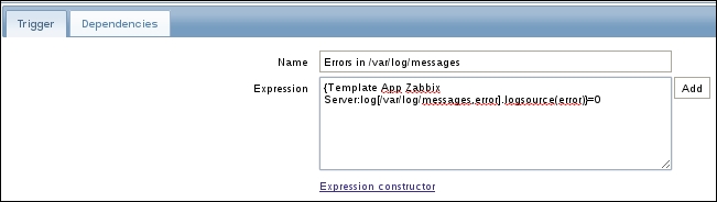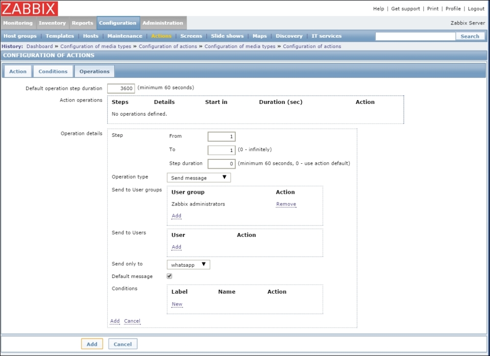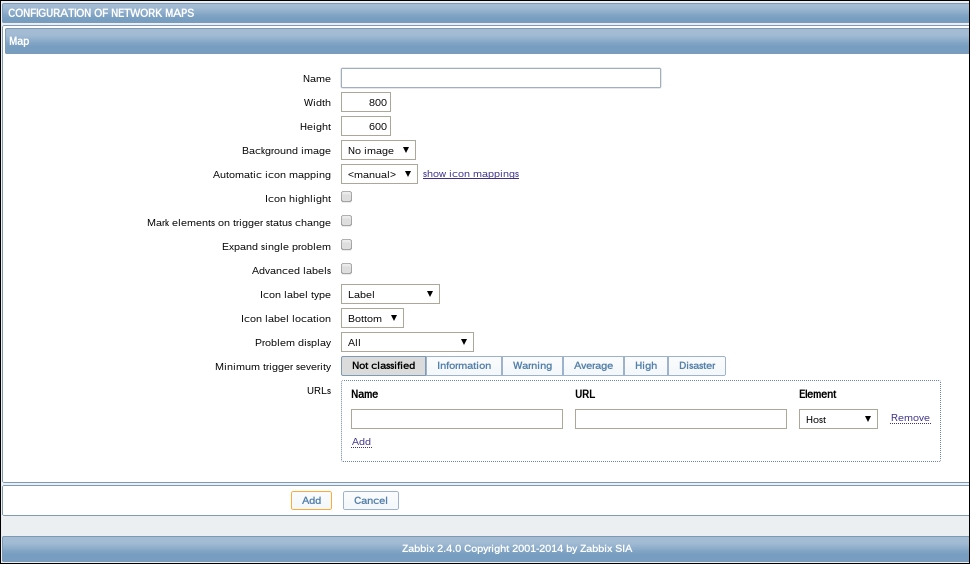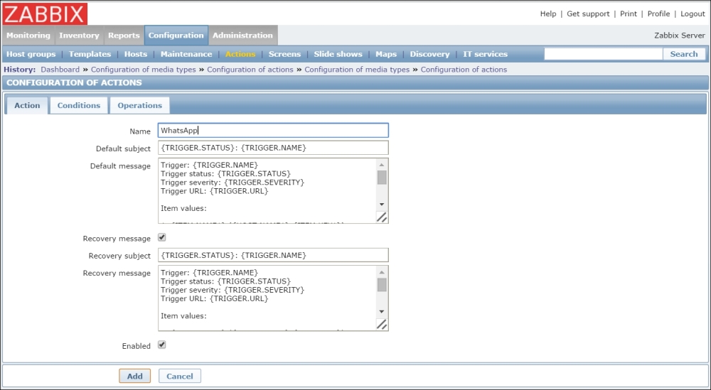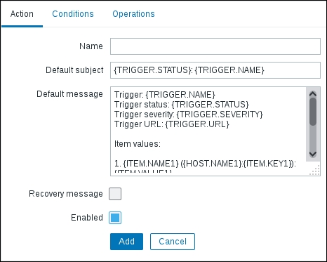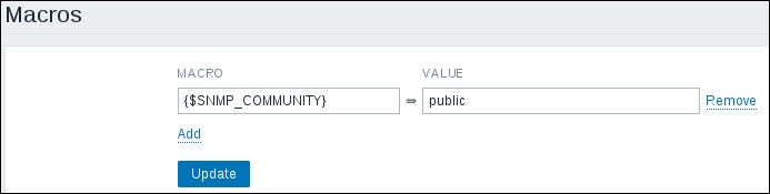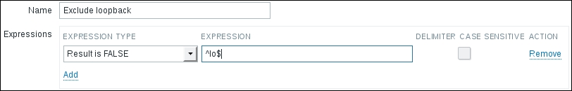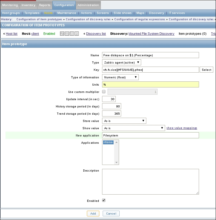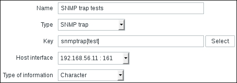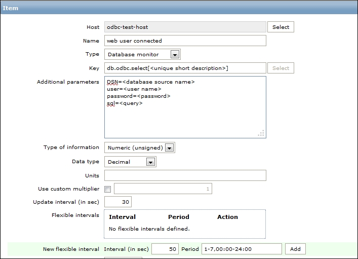 Replace the content in the square brackets with eth0 so that the field contents read net.if.in[eth0]. When you're done, click on the Add button at the bottom. Never leave placeholders such as <mode>—they will be interpreted as literal values and the item will not work as intended.