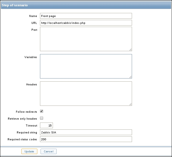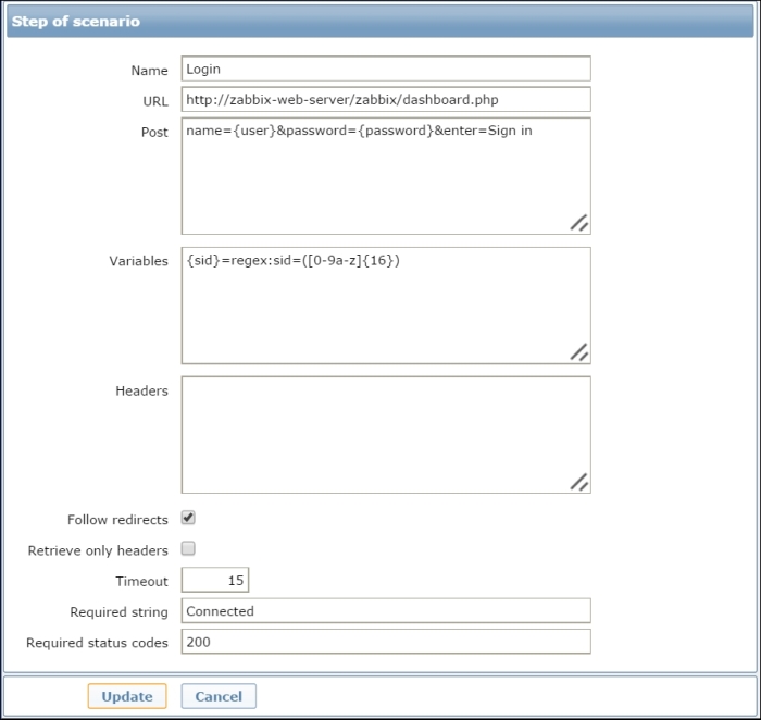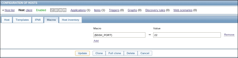 Let's try to monitor another service now, for example, the one running on port 22, SSH. To keep things simple for us, we won't create an item from scratch this time; instead, go back to Configuration | Hosts, click on Items next to Another host, and click on Web server status in the NAME column. This will open the item editing screen, showing all the values we entered before. This time, there are different buttons available at the bottom. Among other changes, instead of the Add button, there's an Update one.