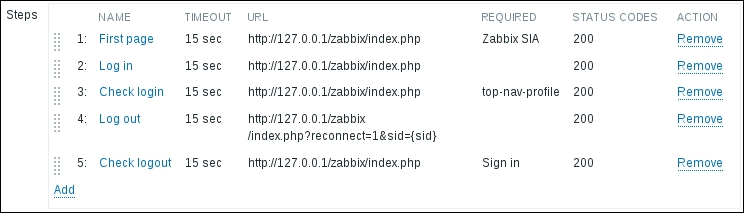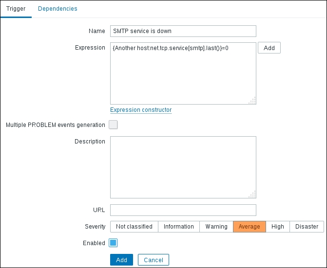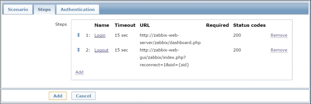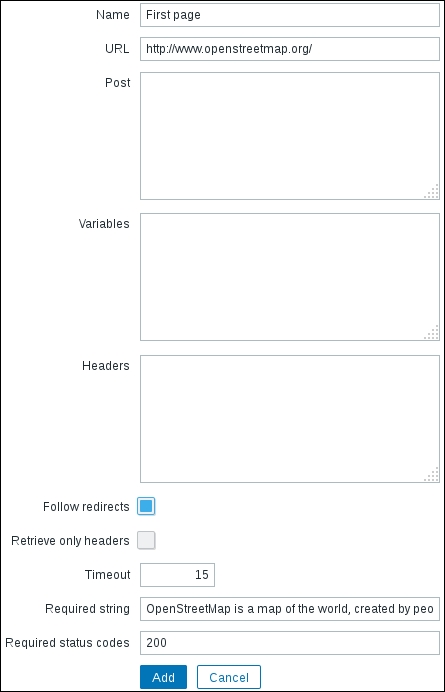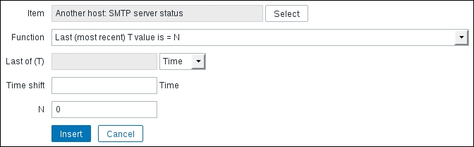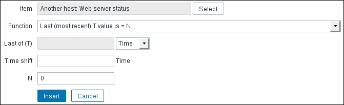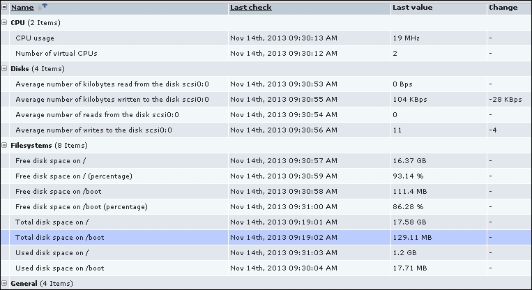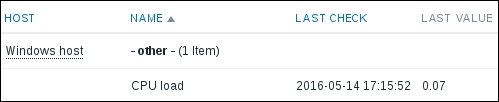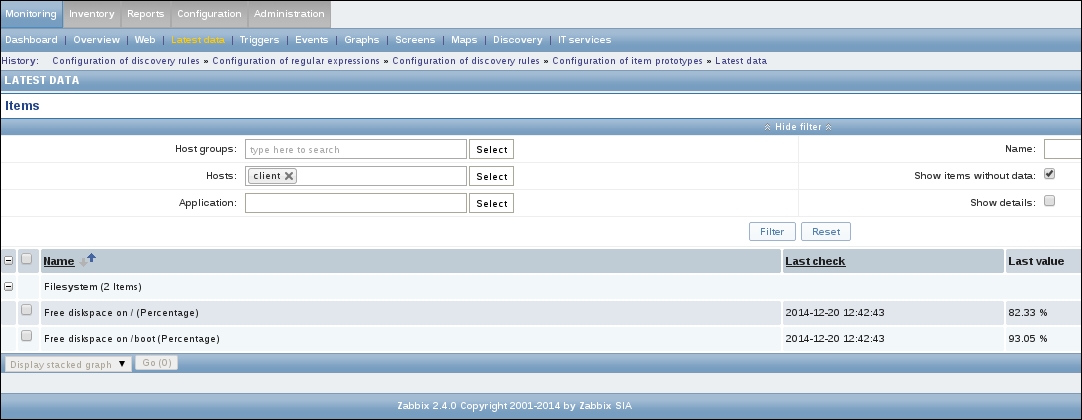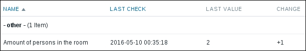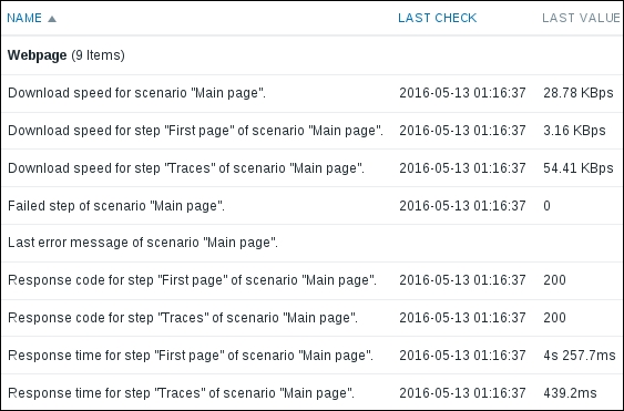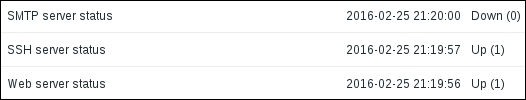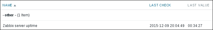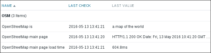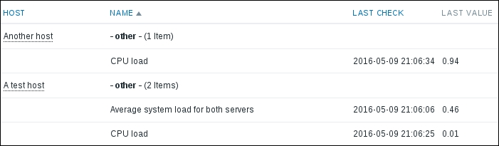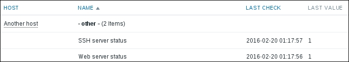 That's all we have to do for now, so click on the Add button at the bottom again. This time, the item should be added successfully. Now, navigate to Monitoring | Latest data, where Another host should have two items listed: SSH server status and Web server status. Their status will depend on which services are running on the remote host. As it's remote, SSH most likely is running (and thus has a value of 1), but whether or not the web server is running will be specific to your situation.