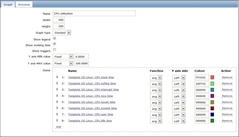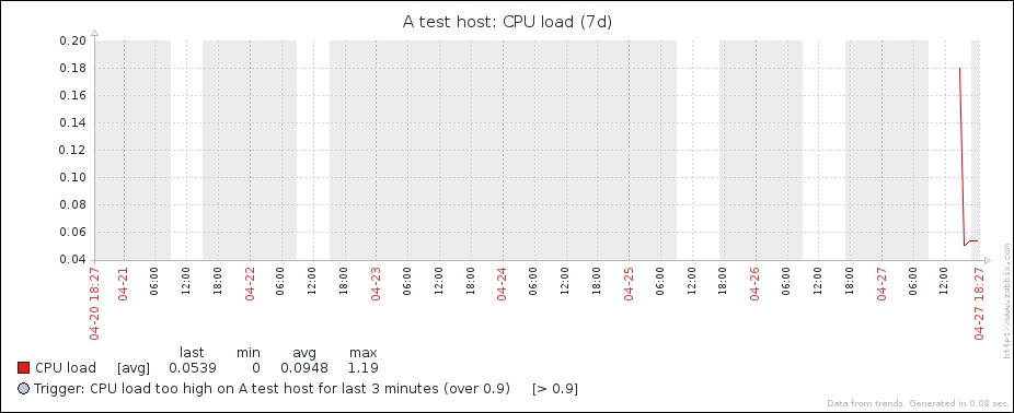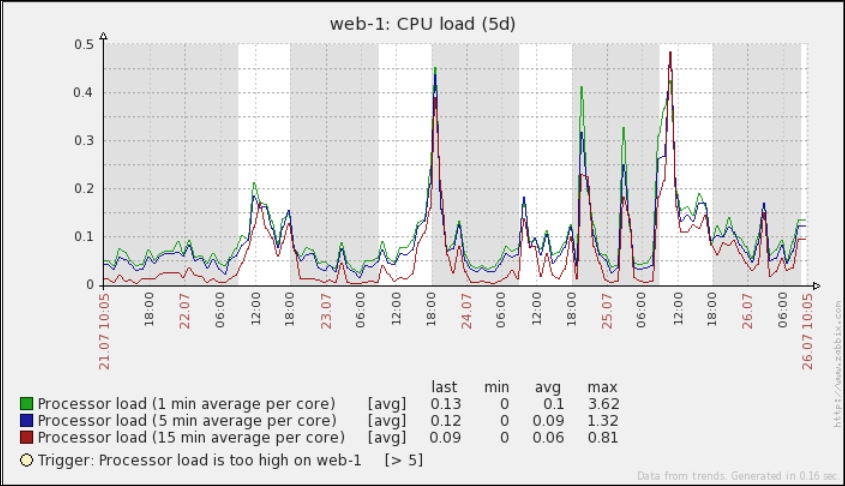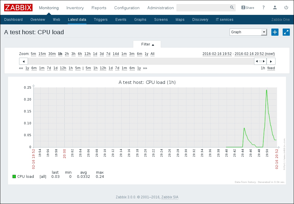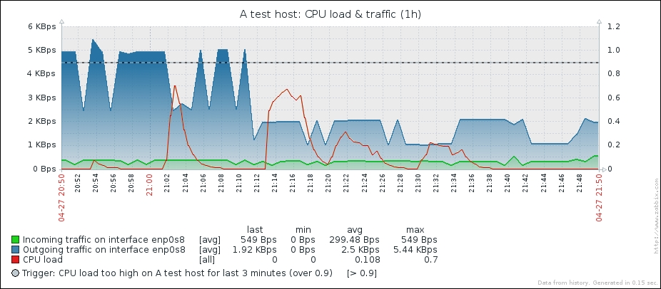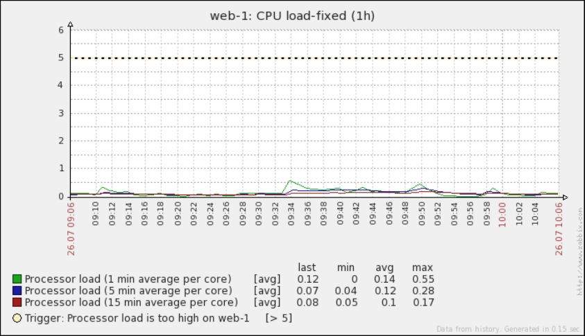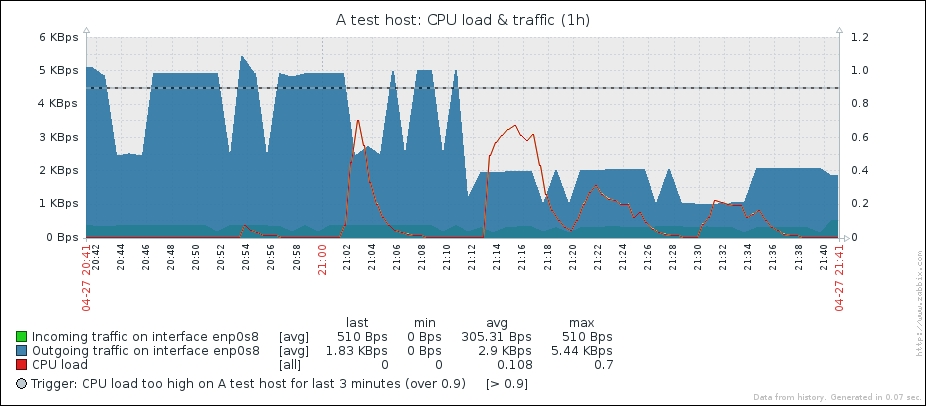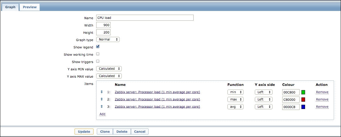 One parameter that we set, the update interval, could have been smaller, thus resulting in a better-looking graph. But it is important to remember that the smaller the intervals you have on your items, the more data Zabbix has to retrieve, and each second, more data has to be inserted into the database and more calculations have to be performed when displaying this data. While it would have made no notable difference on our test system, you should try to keep intervals as large as possible.