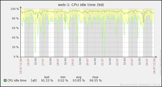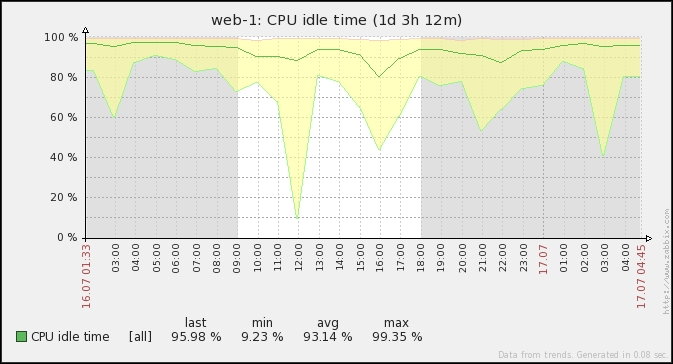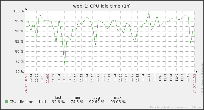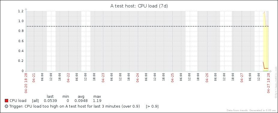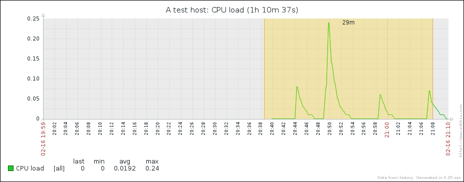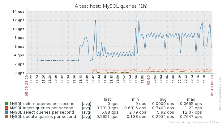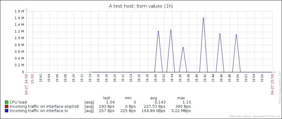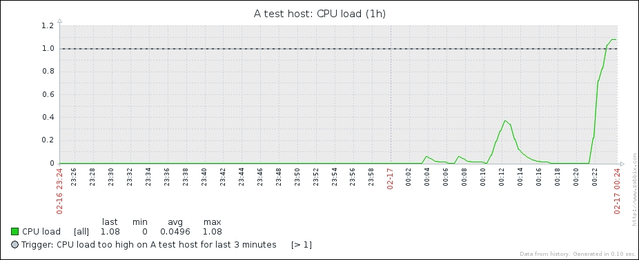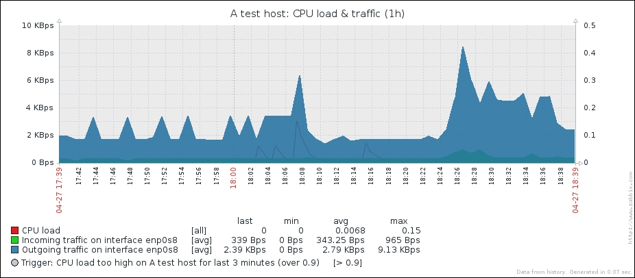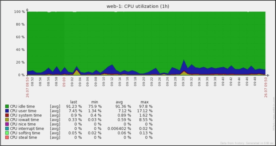 One parameter that we set, the update interval, could have been smaller, thus resulting in a better-looking graph. But it is important to remember that the smaller the intervals you have on your items, the more data Zabbix has to retrieve, and each second, more data has to be inserted into the database and more calculations have to be performed when displaying this data. While it would have made no notable difference on our test system, you should try to keep intervals as large as possible.