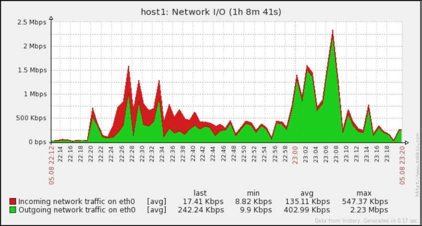 Still, looking at the Y axis in that graph, we see the incoming values being represented as a number without any explanation of what it is, and larger values get K, M and other multiplier identifiers applied. It would be so much better if Zabbix knew how to calculate it in bytes or a similar unit. Right, so navigate to Configuration | Hosts and click on Items next to Another host, and then click on the Incoming traffic on the eth0 interface in the NAME column. Edit the Units field and enter Bps, and then click on Update.