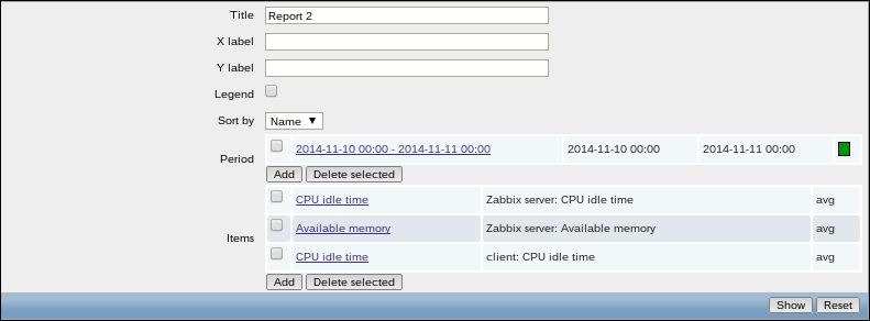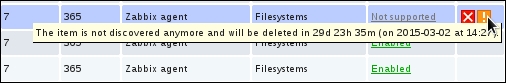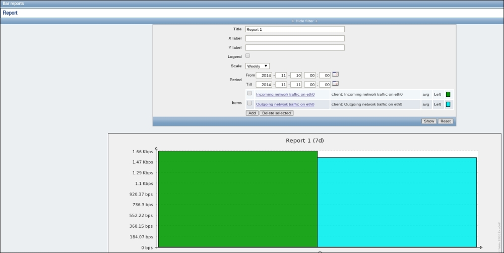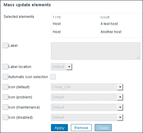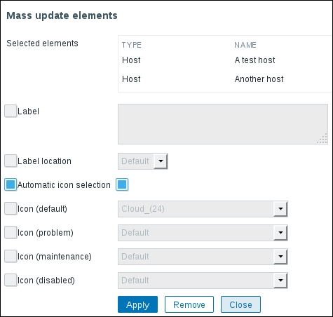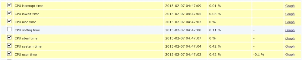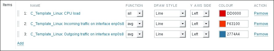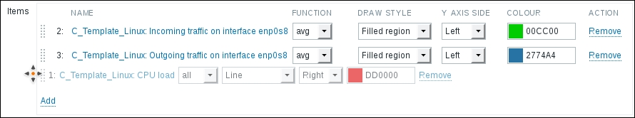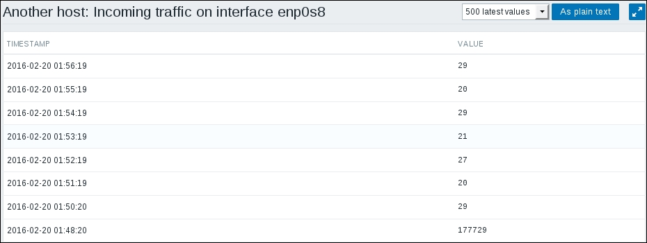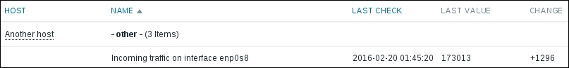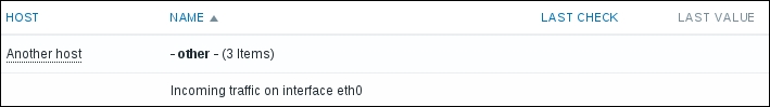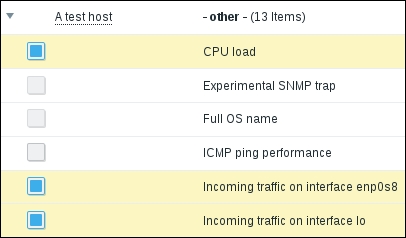 In this list, we can nicely see the change in data representation as well as the exact time when the change was performed. But those huge values have come from the counter data, and they pollute our nice, clean graph by being so much out of scale—we have to get rid of them. Go to Configuration | Hosts and click on Items next to Another host, then mark the checkbox next to the Incoming traffic on interface eth0 item, and look at the buttons positioned at the bottom of the item list: