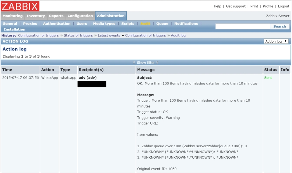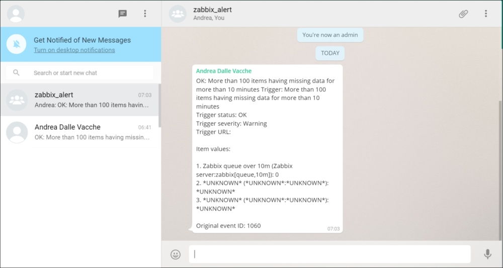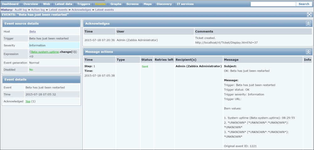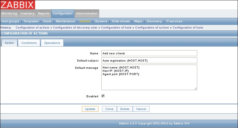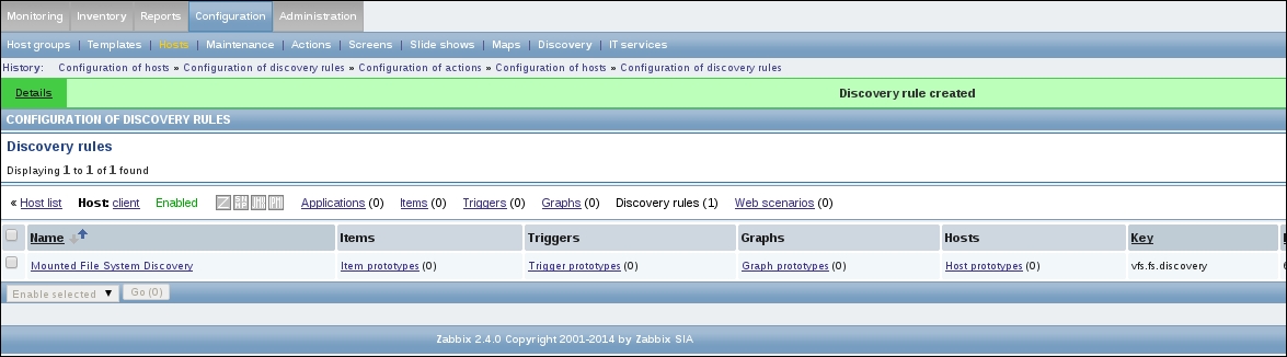 If we carefully read the entry, we will notice that the agent is reporting its hostname as Zabbix server, but that is the hostname of the default host, which we decided not to use and left disabled. The log message agrees: it says that the host is not monitored.