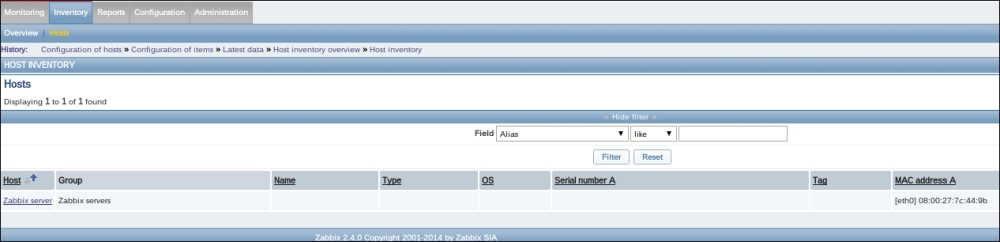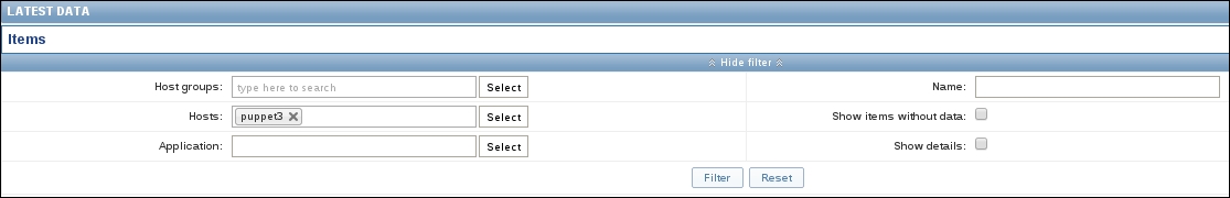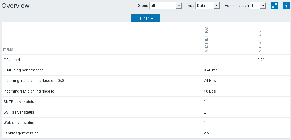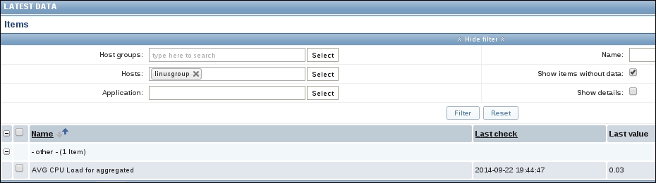 Finally, it should be worth opening Monitoring | Latest data. We will only see our previously created item, though; the reason is the same filter we changed earlier. We explicitly filtered for one host; thus, the second host we created does not show up at all. In the filter, which should still be expanded, clear the host field and select Linux servers in the Host groups field, and then click on Filter: