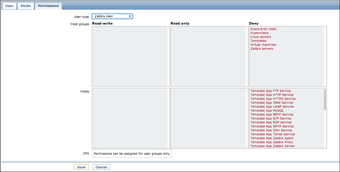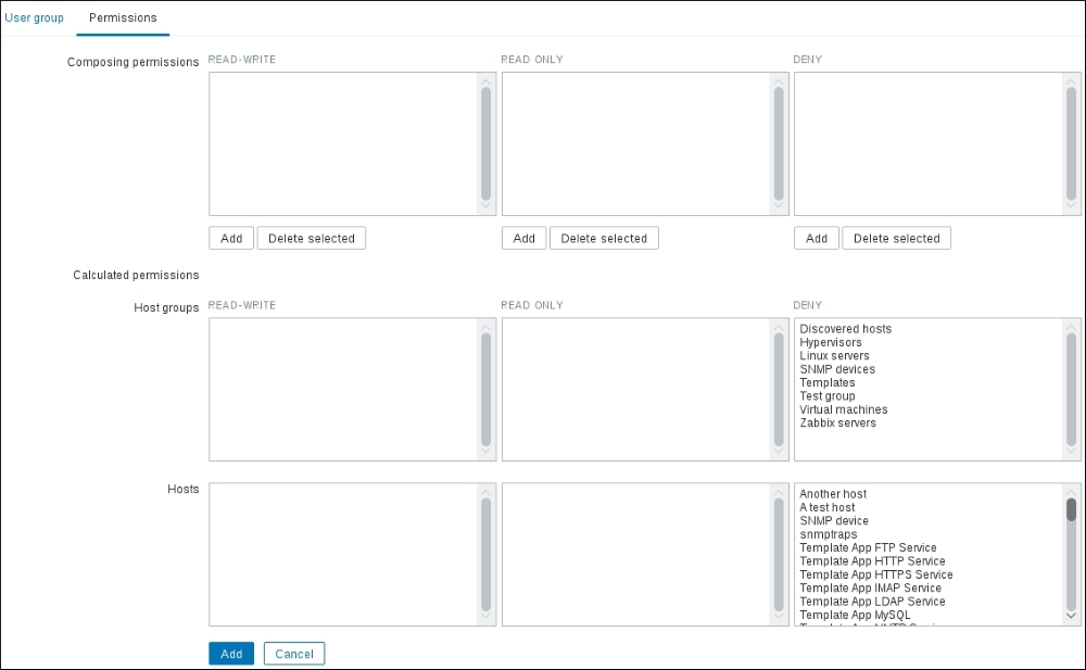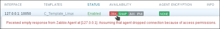 If you did this correctly (or if you did not have a firewall blocking the connection), you could again go to Monitoring | Latest data—only that would be pointless, again. To see why, refresh the host list. Soon, you should see the Zabbix agent status icon turn red again, and moving your mouse cursor over it will reveal another error message, Received empty response from Zabbix Agent at [192.168.56.11], assuming that the agent dropped the connection because of access permissions. Now that's different. What access permissions is it talking about, and why did they work for our first host?